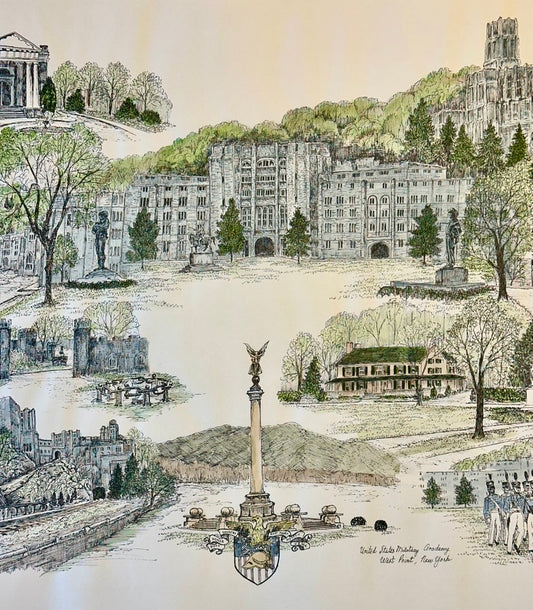 U.S. Military Academy West Point Campus Print by Liz Bryant – Hand-Colored Architectural Illustration, 24” X 18”