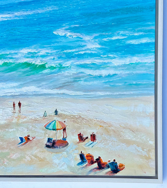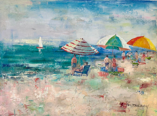 Beach Umbrella Scene, Original Oil on Canvas by Tailroy (framed)