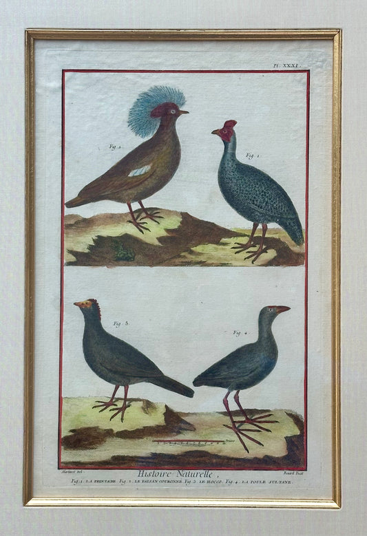Guineafowl Crested Partridge, Curassow Purple Moorhen Original Print From Histoire Naturelle, 1751