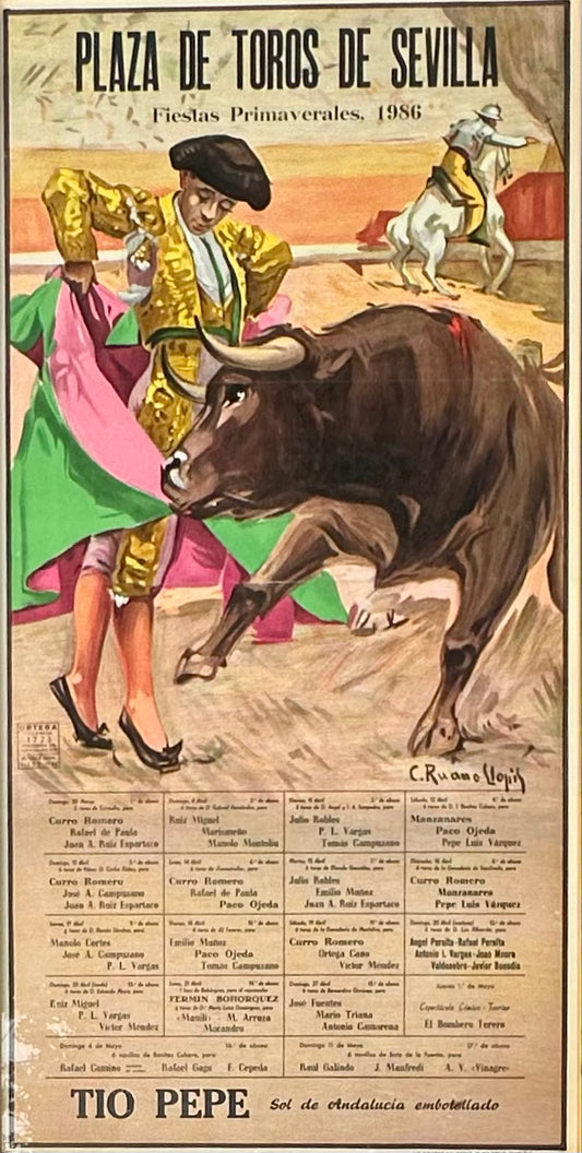 Plaza De Toros De Sevilla Bull Fighting Original lithograph by Carol Ruana Llopis, framed, 1986