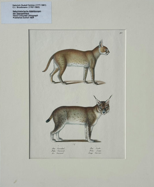 Lynx & Caracal Cats Original Hand Colored Lithograph by Schinz, 1824