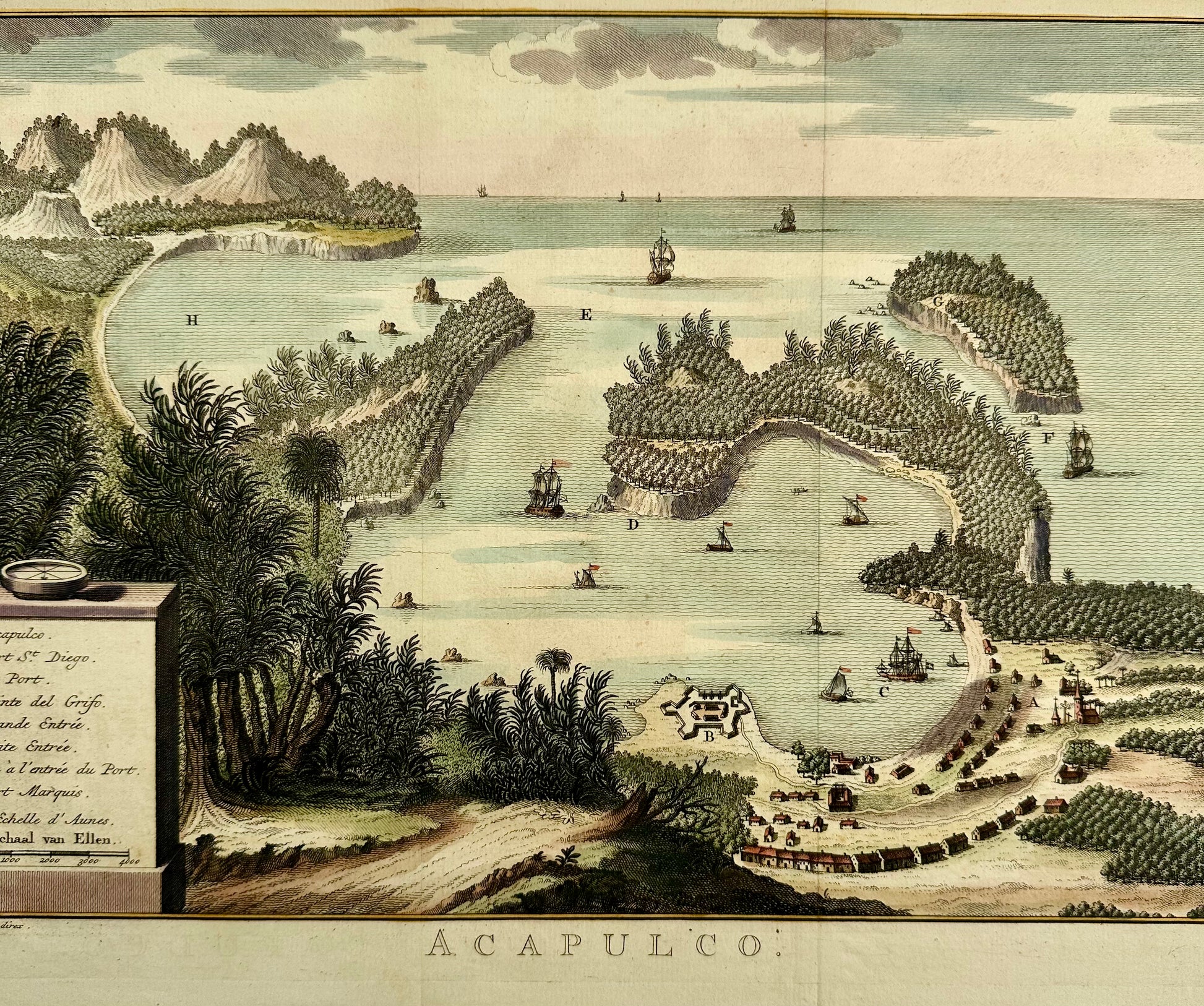 This rare bird's-eye view of Acapulco and its bay gives a nice rendering of the town, Fort St. Diego, and the neighboring Puerto Marques Bay. A lettered key identifies each location. Ships fill the harbor, with others at sea as far out as the horizon. Dimensions: 9 x 13”