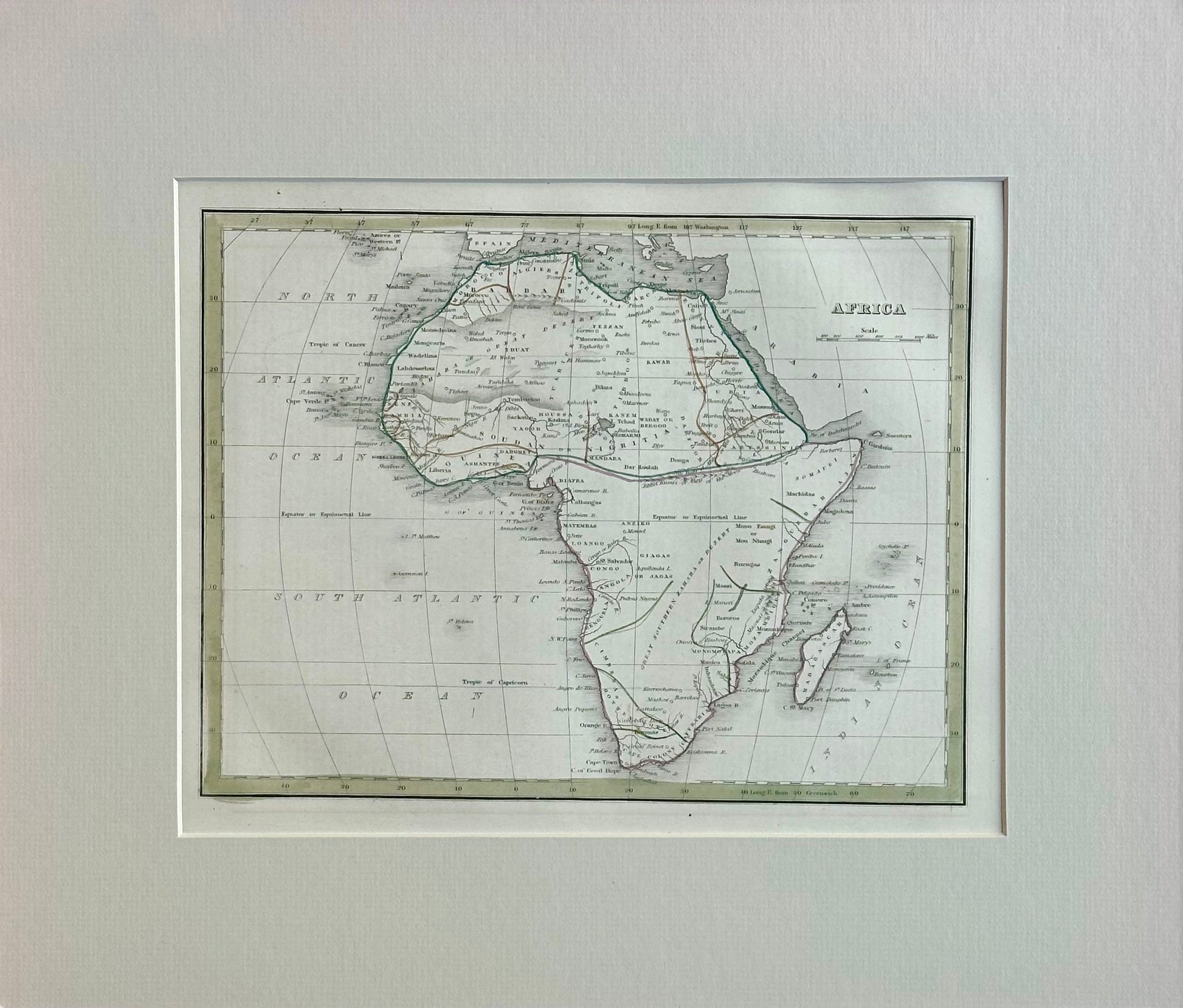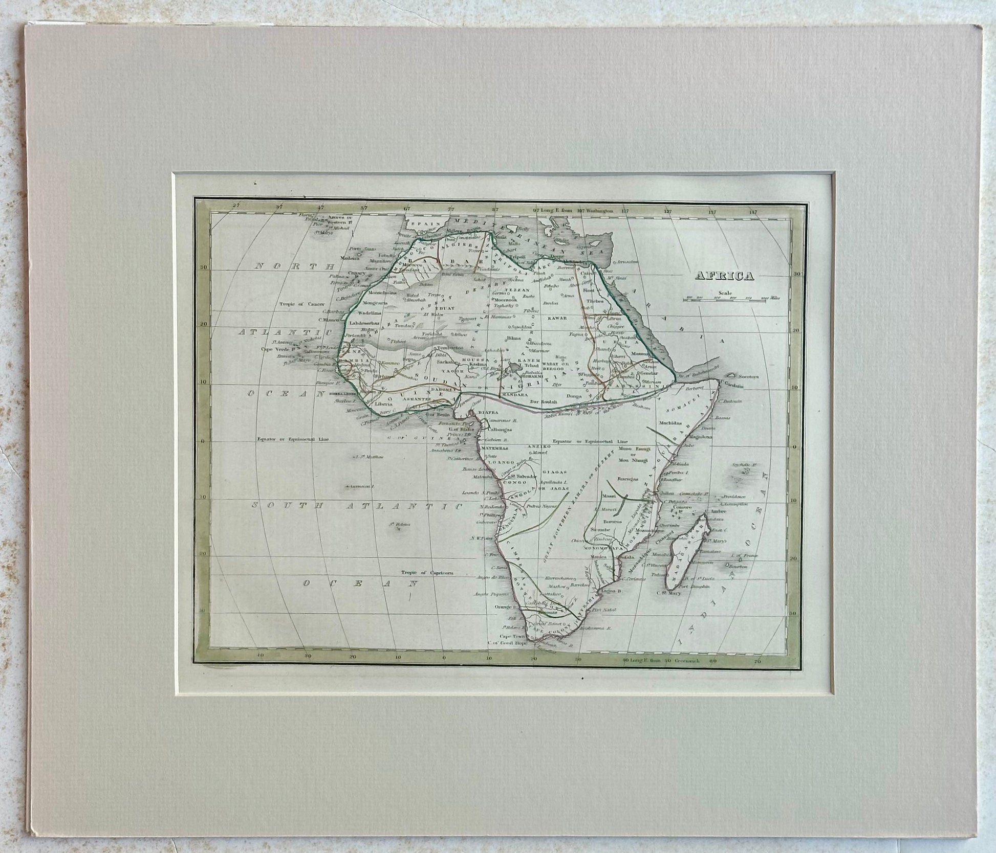 Original antique, hand-colored map of Africa from 1835, created by Thomas G. Bradford. Published in Boston for his "Atlas of Universal Geography". The map features the apocryphal "Mountains of the Moon" range across the center of the continent. Matted. Dimensions: 15.5 x 13”