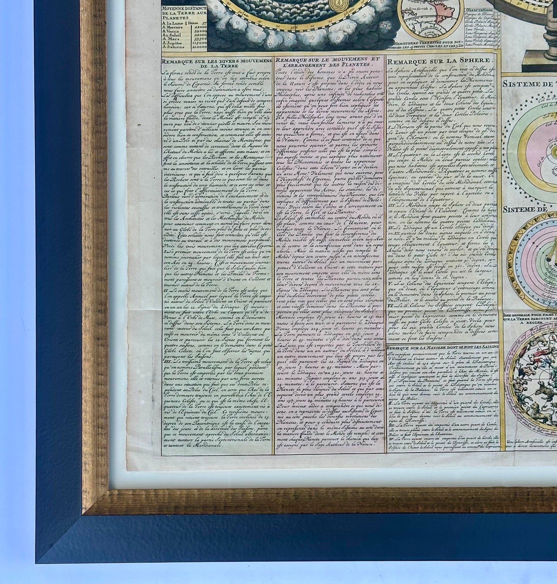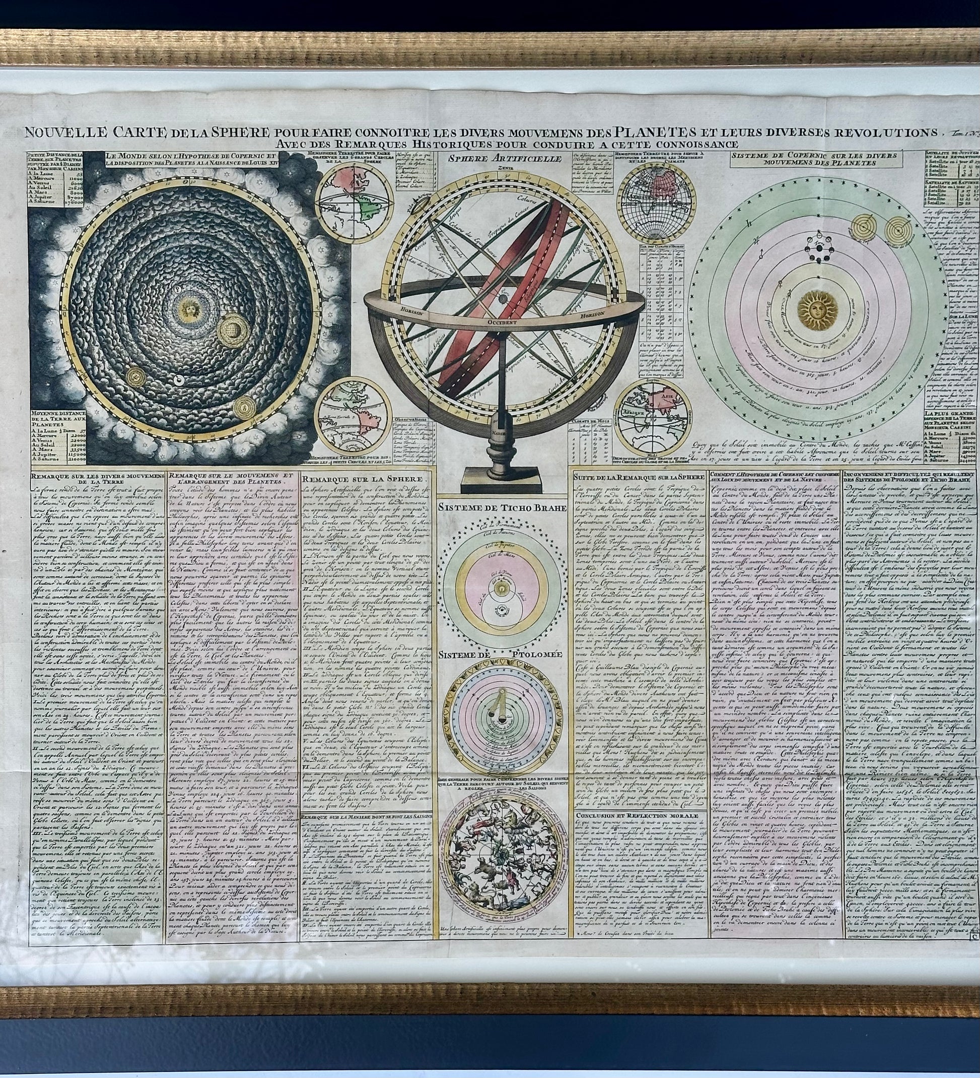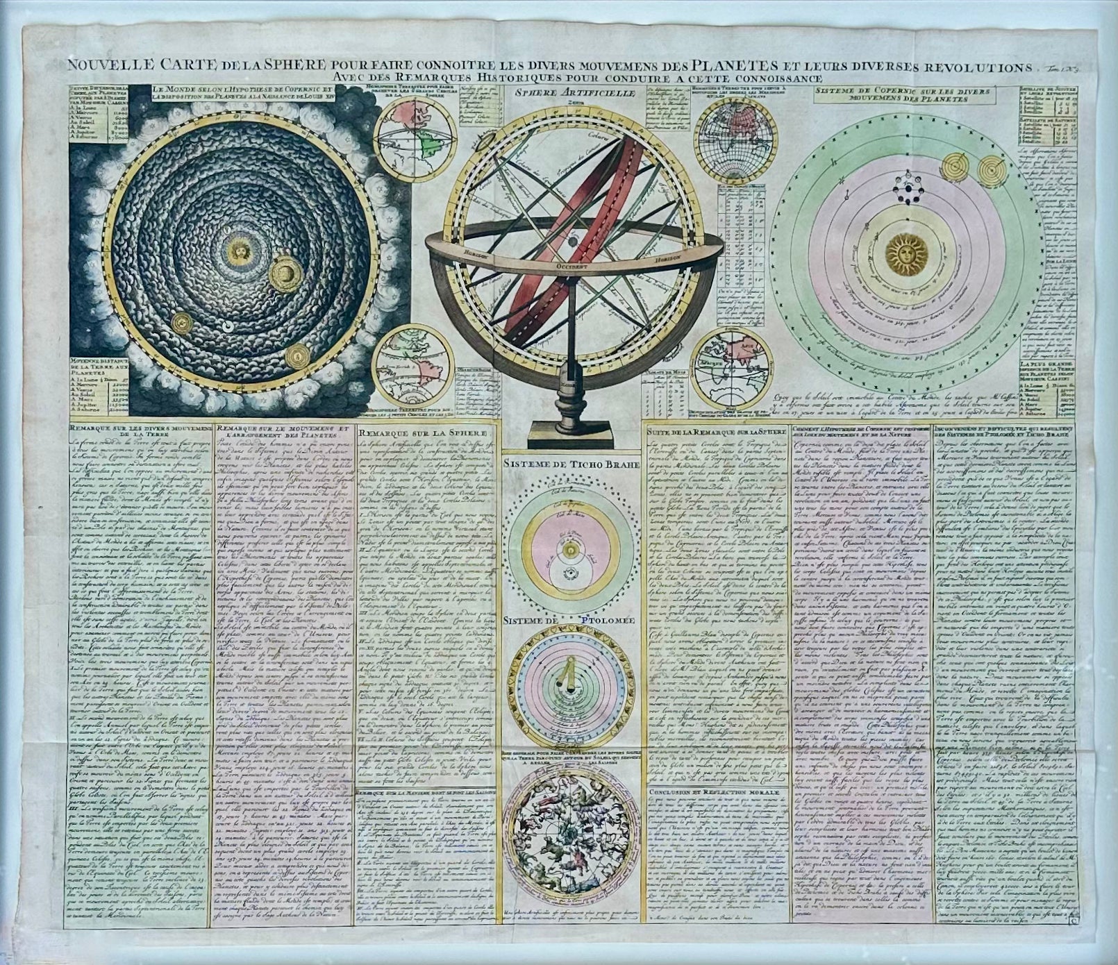 The print features a central depiction of an armillary sphere, flanked by diagrams illustrating the Copernican heliocentric system, the Ptolemaic geocentric model, and the Tychonic system — reflecting the great scientific debate of the era. Additional vignettes include hemispheric world maps, a stunning dark-ground Copernican world diagram, and a detailed star chart at lower center. Dense French-language commentary fills the lower portion of the sheet, offering historical and scientific context for each system depicted.