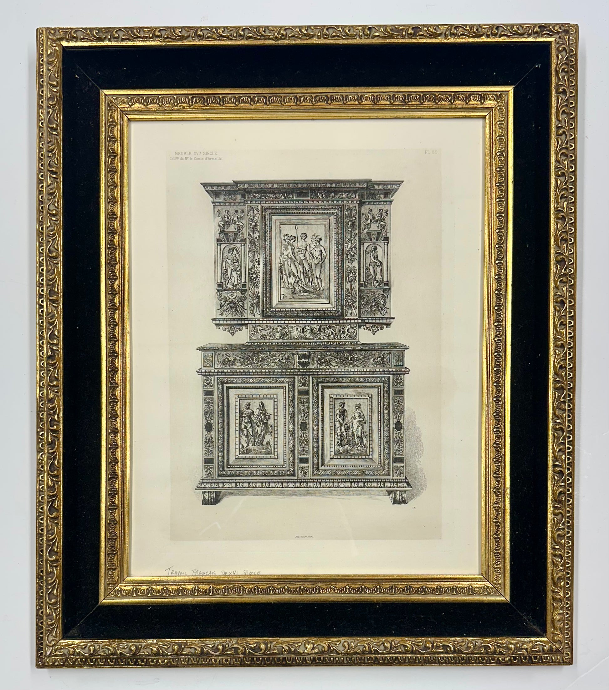 Original 19th-century engraving depicting ornate 16th–17th century European cabinetry and furniture design by Albert Racinet, 1888 publication Le Costume Historique . The composition features a grand, two-part architectural cabinet richly adorned with classical figures, sculptural reliefs, and intricate paneling—hallmarks of the Louis XIII style, which drew strong influence from the Italian Renaissance.
