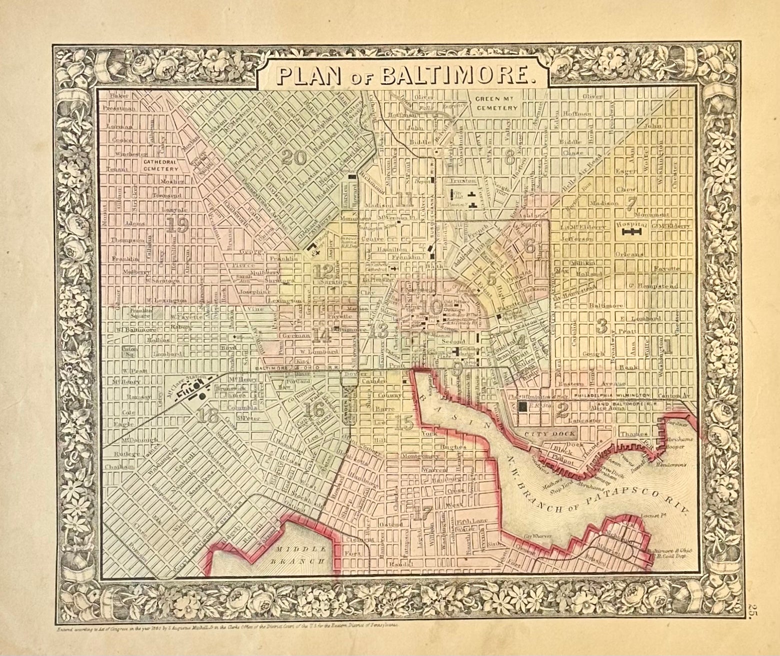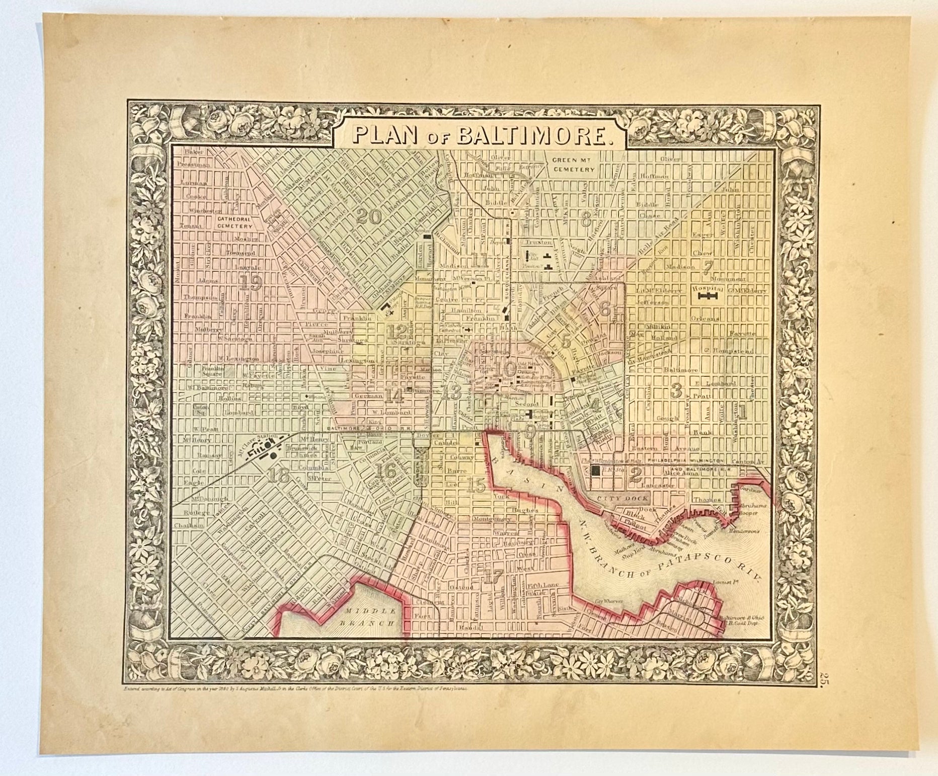 Original Steel Engraving detailing city of Baltimore by Samuel Mitchell, 1863. Dimensions: 14" x 11.5"