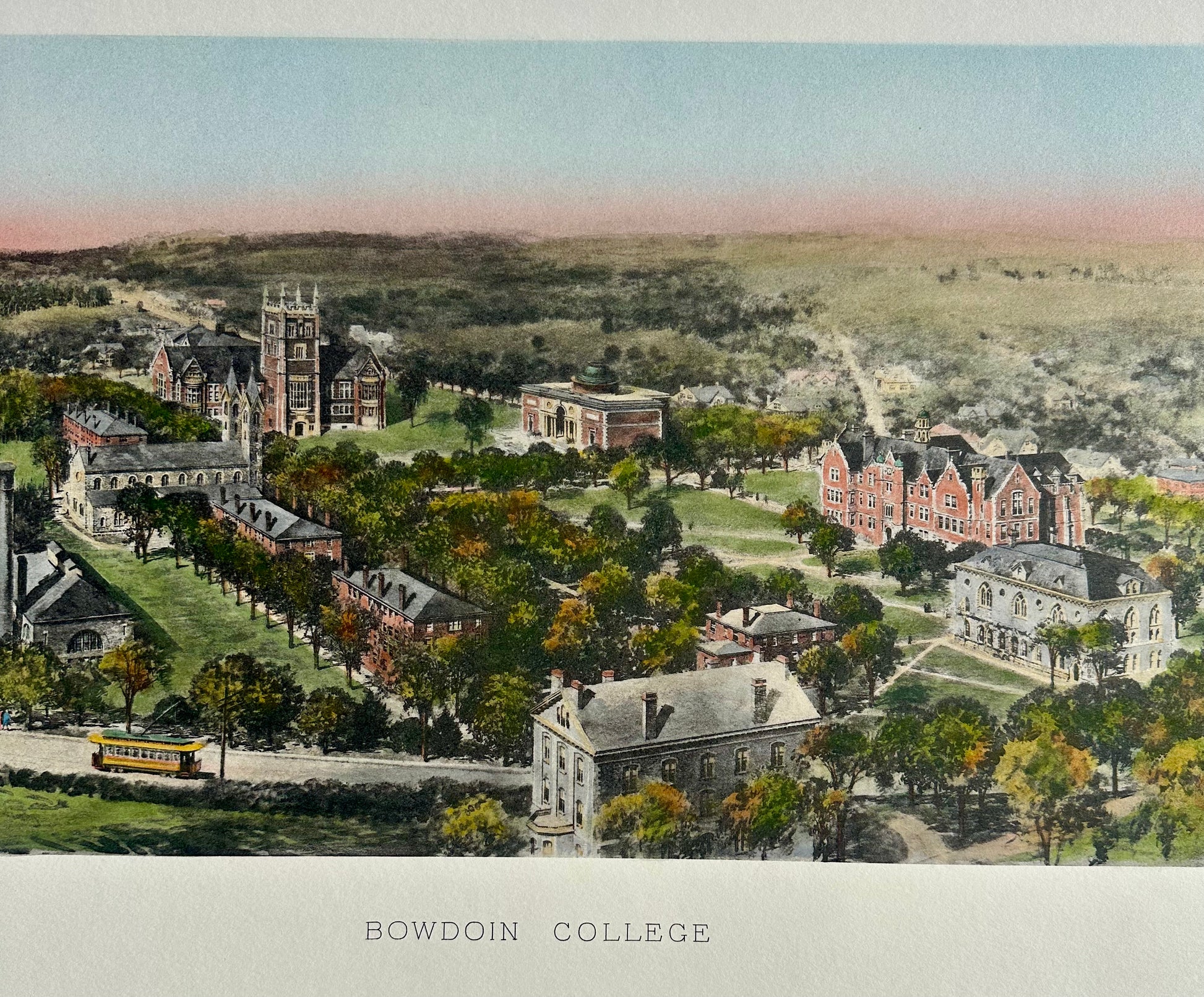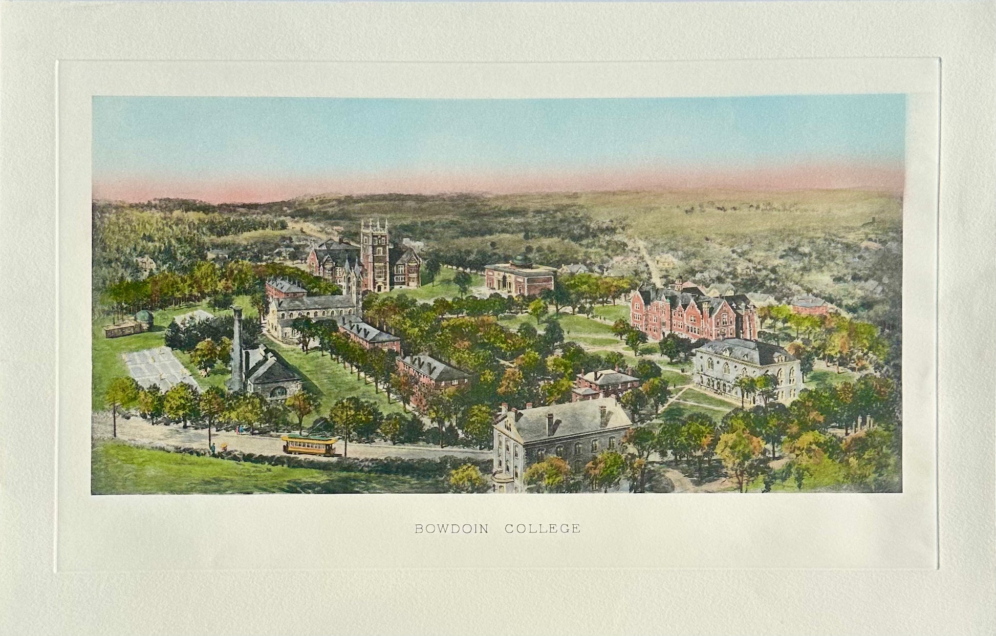 Bowdoin College, Brunswick, Maine. Re-strike engraving from the original plate (c. 1913) after Richard Rummell. Printed on heavy woven paper and hand-colored.
