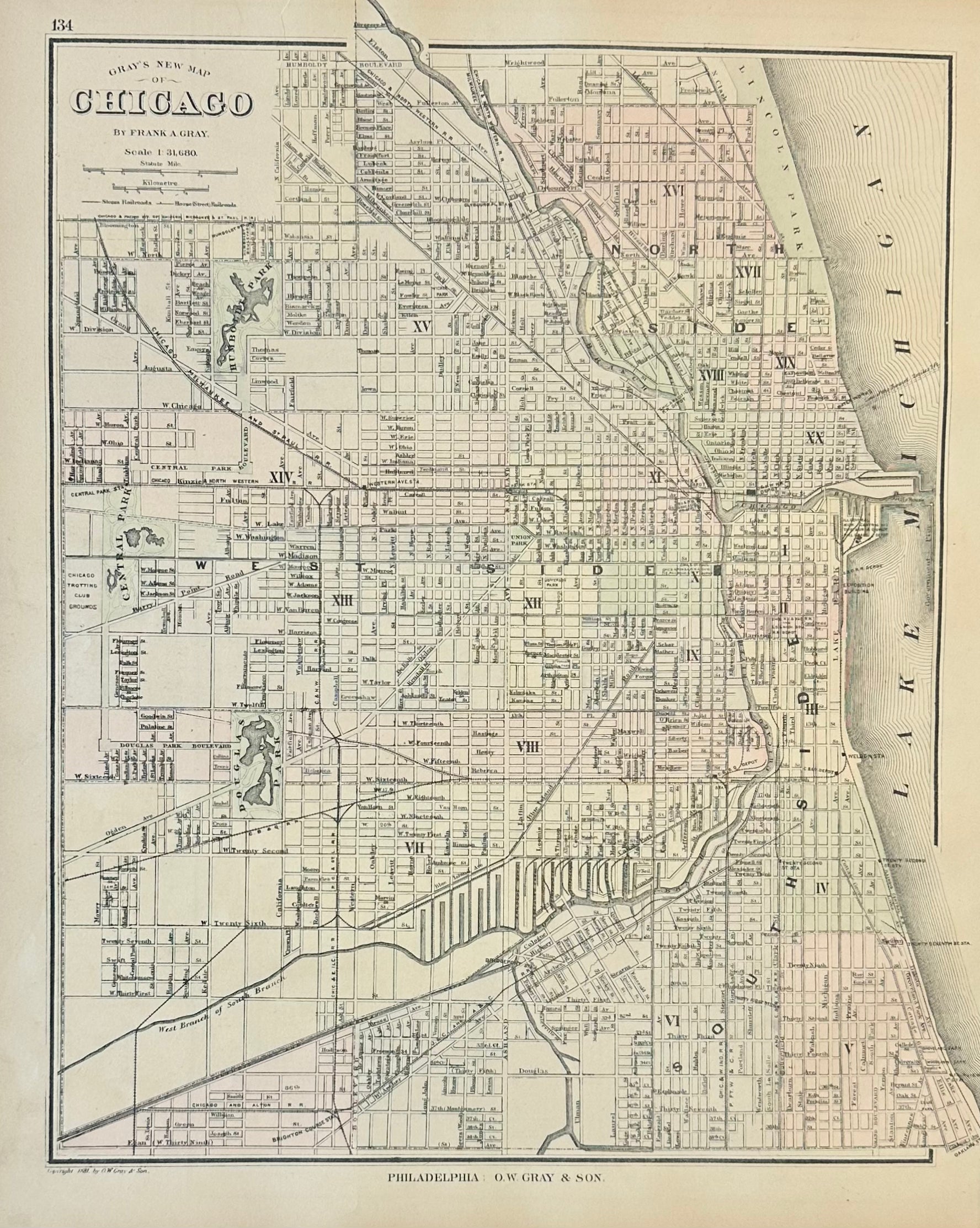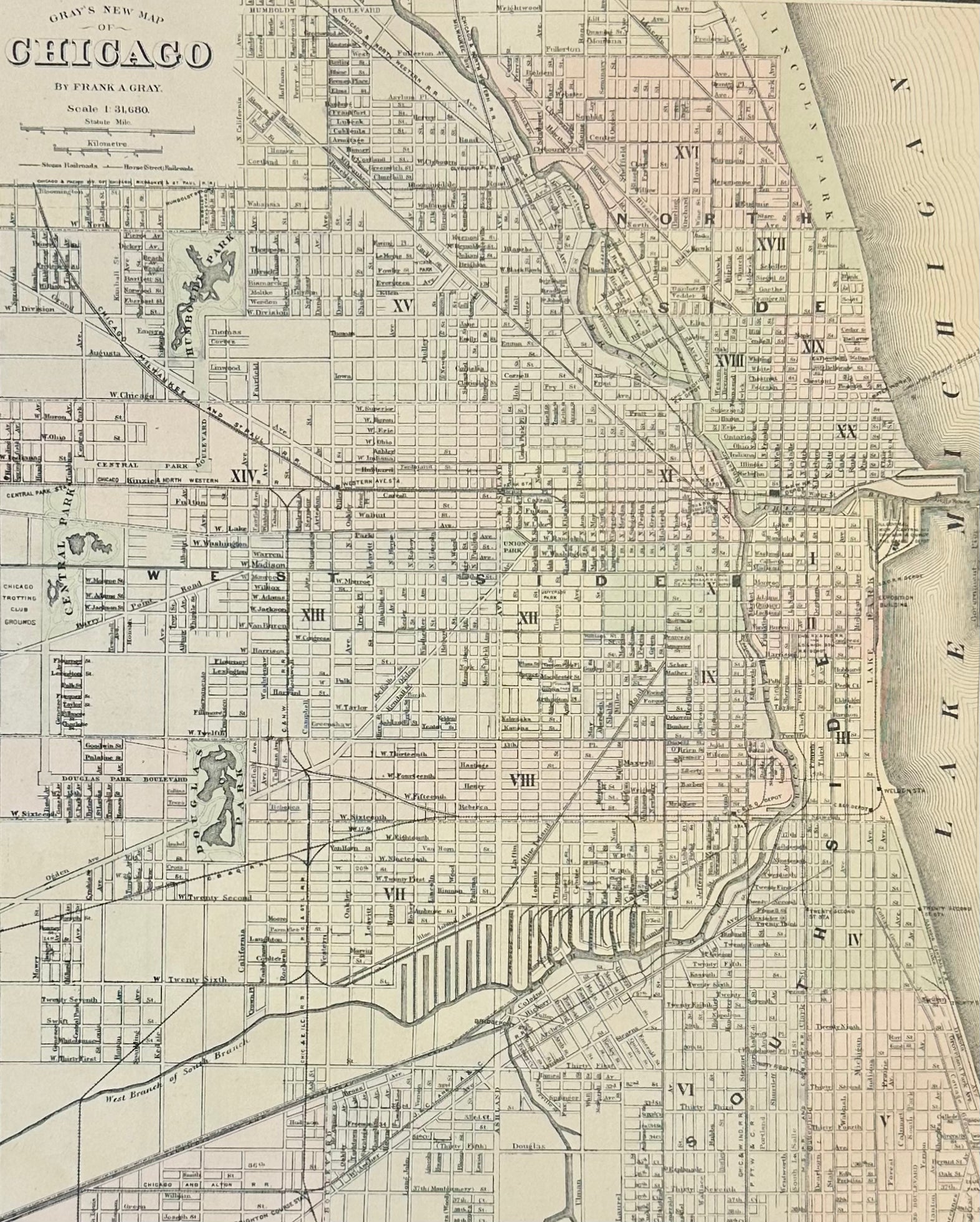 Original Steel Engraving detailing Chicago & Lake Michigan by Frank Gray of Gray's Atlas, Philadelphia, 1870. Dimensions: 14" x 17.25"