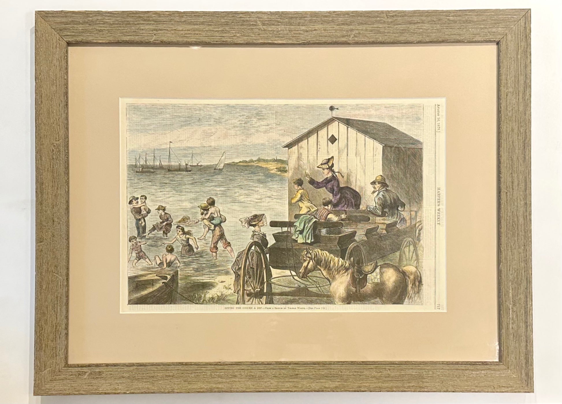 Original steel engraving after sketch by Thomas Worth published by Harper’s Weekly 1873. This print provides a glimpse into the leisure activities and fashion trends of the Victorian era, particularly regarding women's bathing practices. Custom frame & UV-protectant glass. Dimensions: 22 x 17.5”