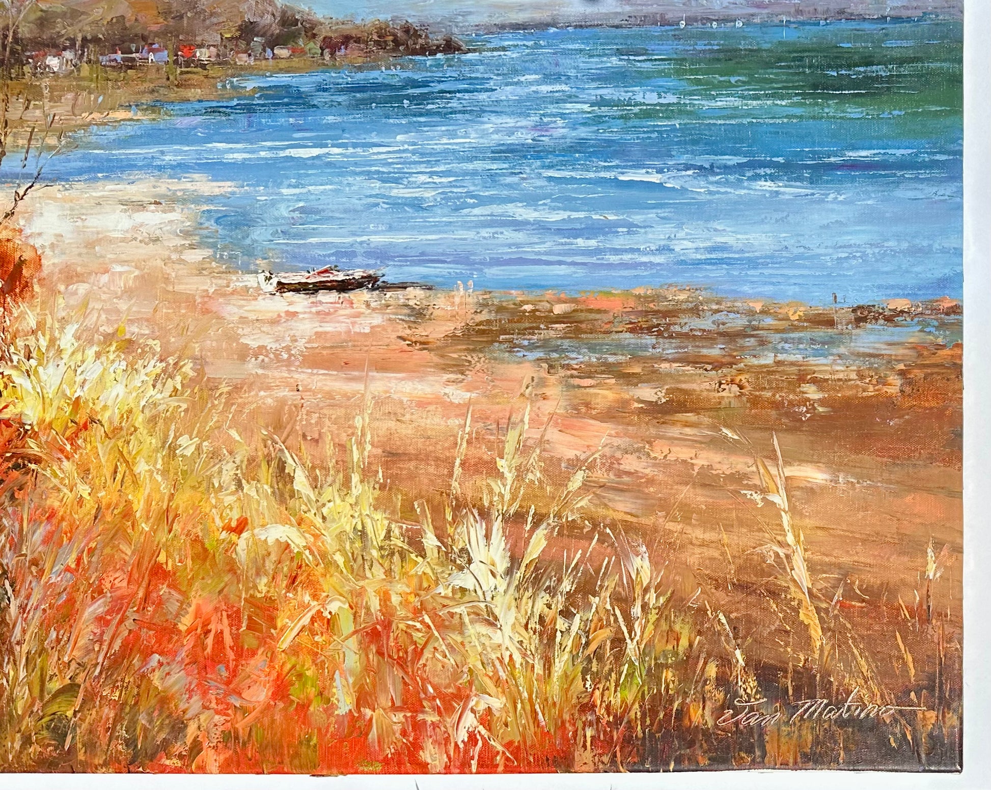 Original oil on canvas by Jan Matino. A beautiful shoreline coastal scene. The painting is stretched and unframed. Dimensions: 30 x 30"