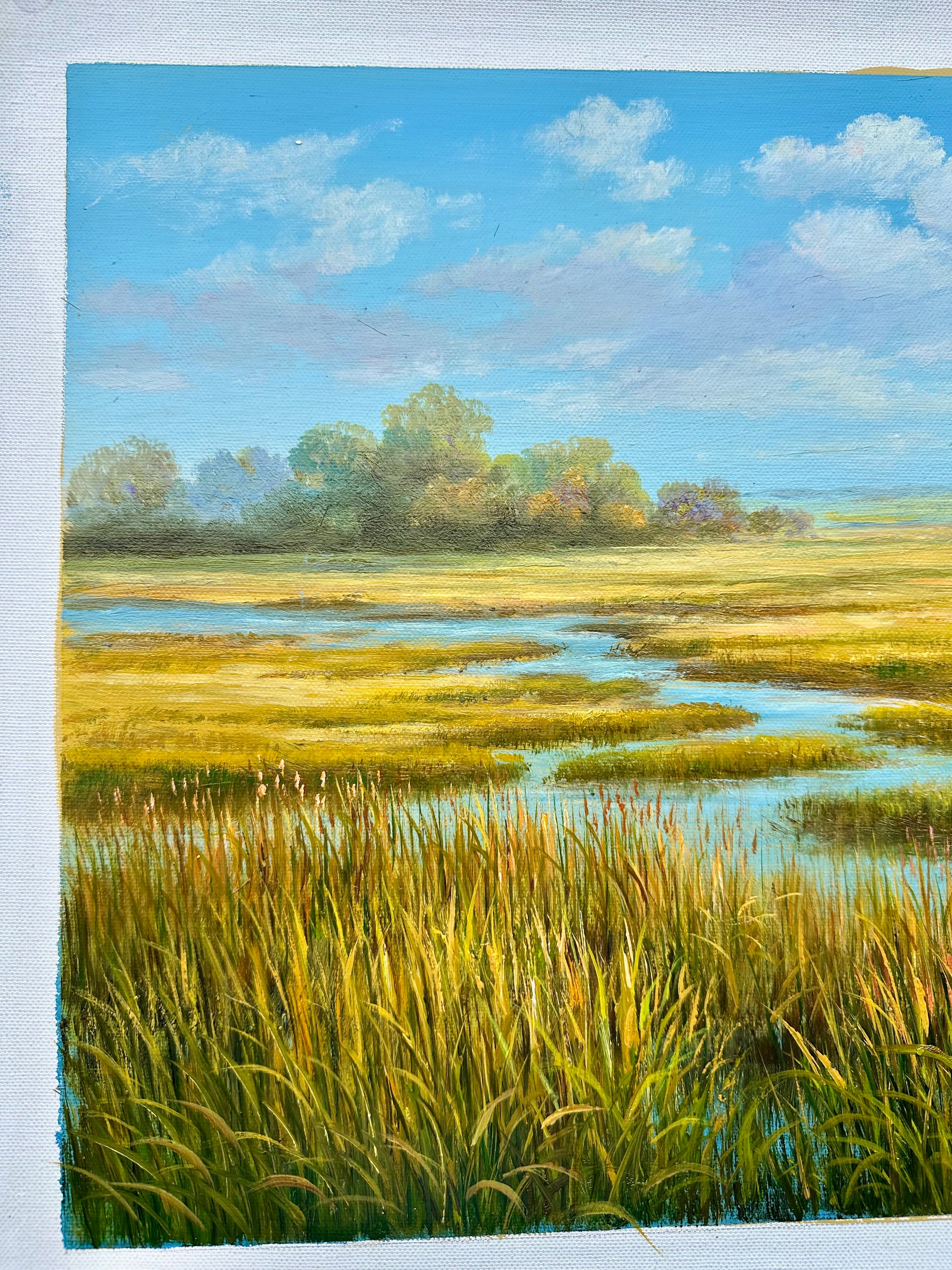 Coastal Winding Blue Marsh Golden Landscape Oil Painting on Canvas, Unstretched, by Humprey