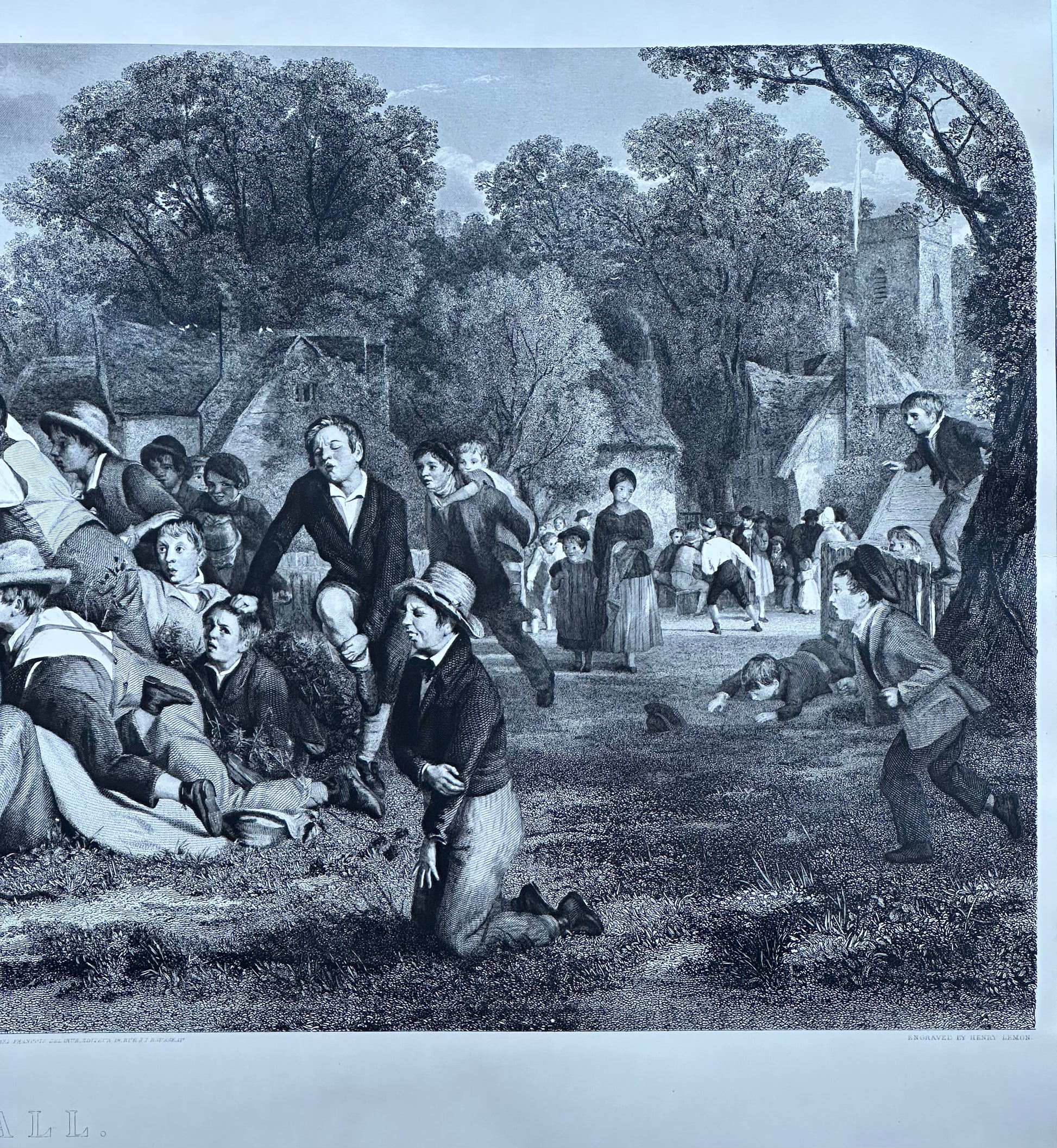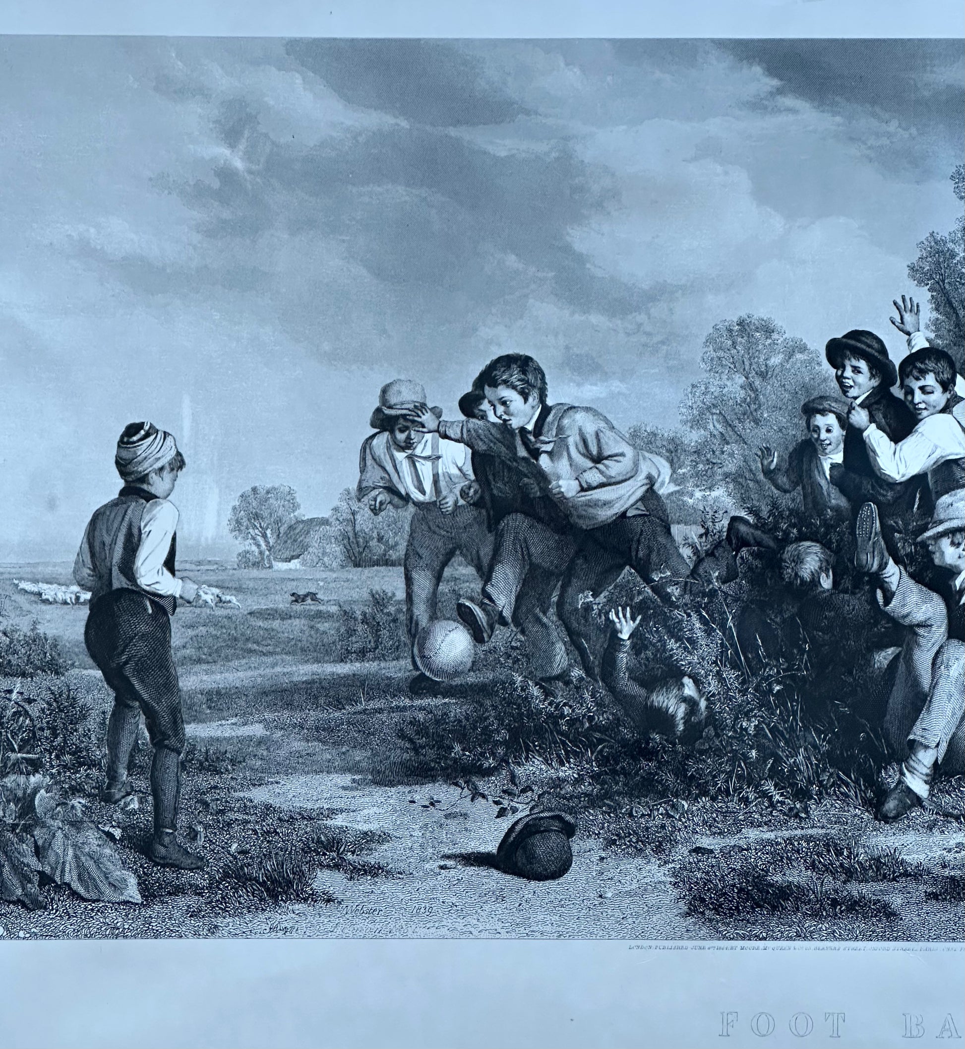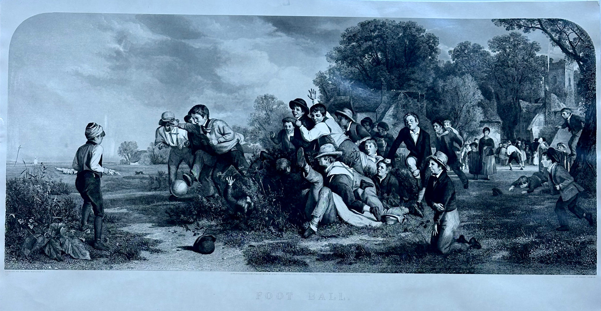 Reproduction print of a photogravure by W.H. Overend, published in 1891 in London. The work depicts an exciting moment during a football (soccer) game as one player prepares to throw the ball to his teammate while the opposing team races towards him. In the background, a large crowd watches the players on the gray, cloudy day. Dimensions: 10 1/2 x 19 3/4"