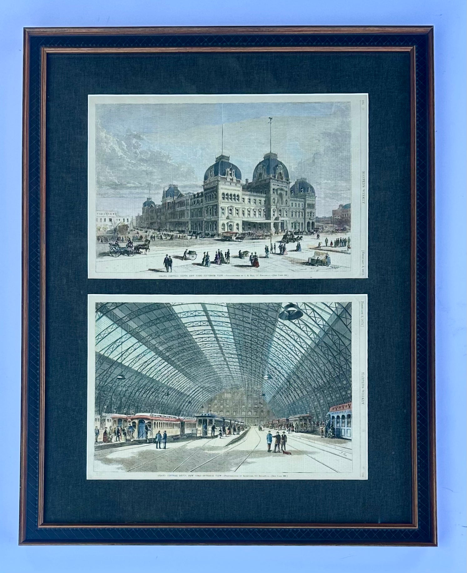 Original hand colored wood engravings from Harper's Weekly, February 3, 1872. The unique pair presents a historical before-and-after perspective on New York's Grand Central Station, both its exterior and interior. The overall effect is decorative and archival, highlighting early American railroad architecture and city life. Custom framed in a charcoal fabric mat, UV-resistant glass and a wood frame. Dimensions: 22" x 27.5”
