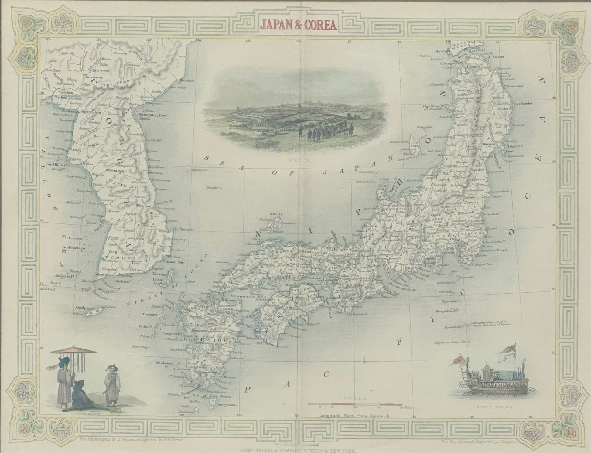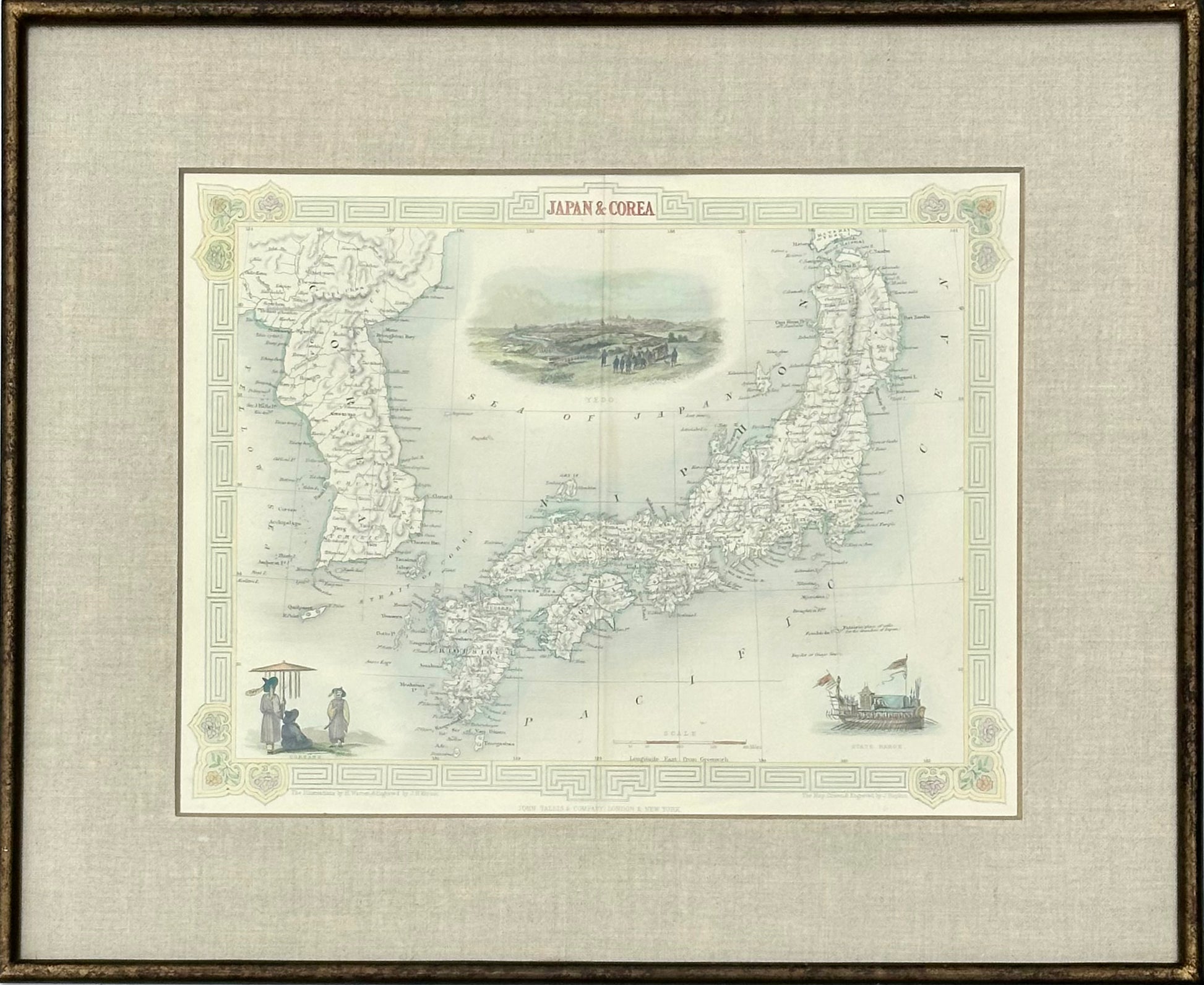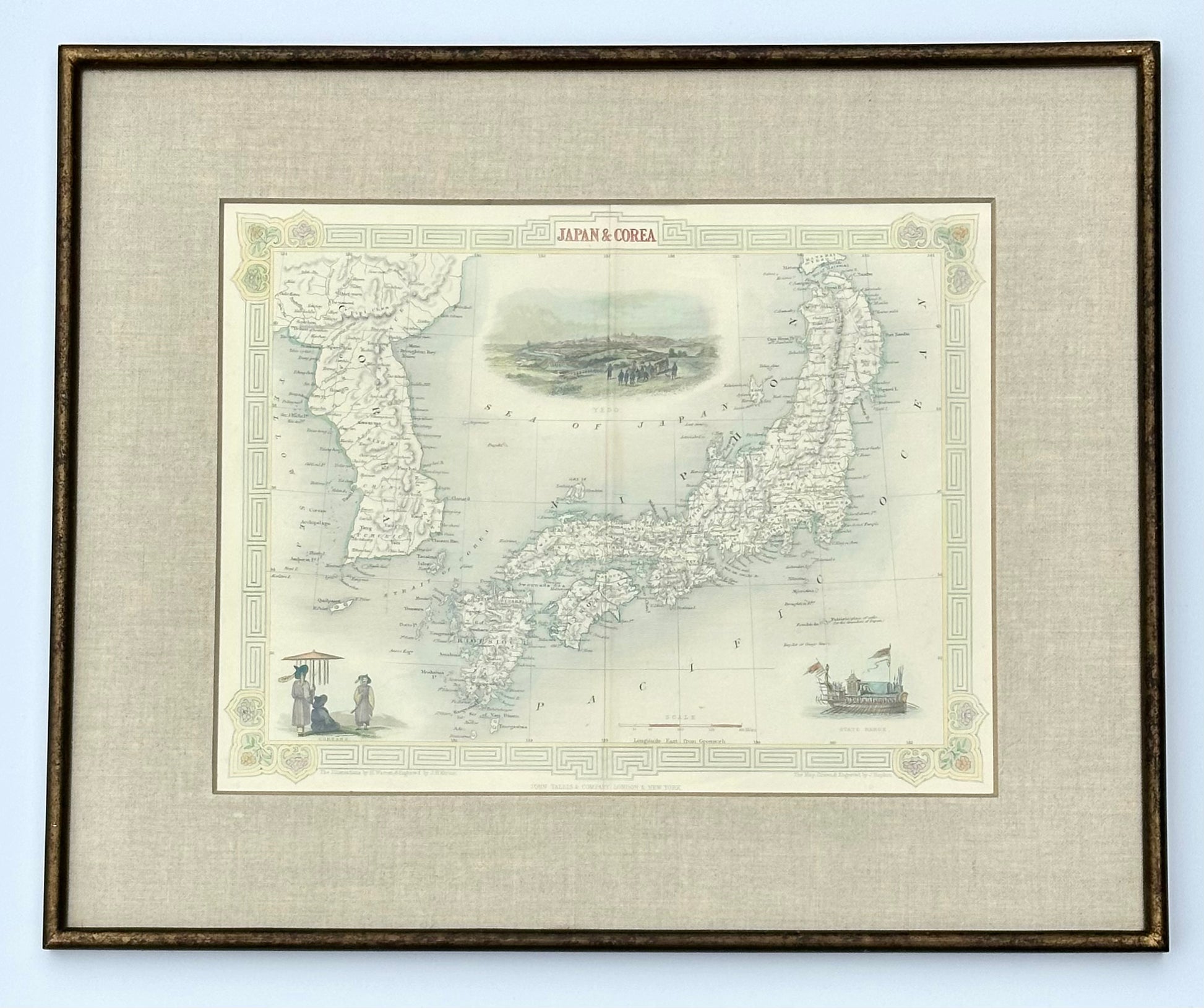 Original steel engraving by John Tallis. Tallis was a British map publisher and published the Illustrated World Atlas, one of the last series of decorative world maps ever produced for the For the Great Exhibition of 1851. Map features Kyushu, Honshu, Shikoku, Hokkaido, Tokyo, Seoul. Custom framed. Dimensions: 19 x 15.5”