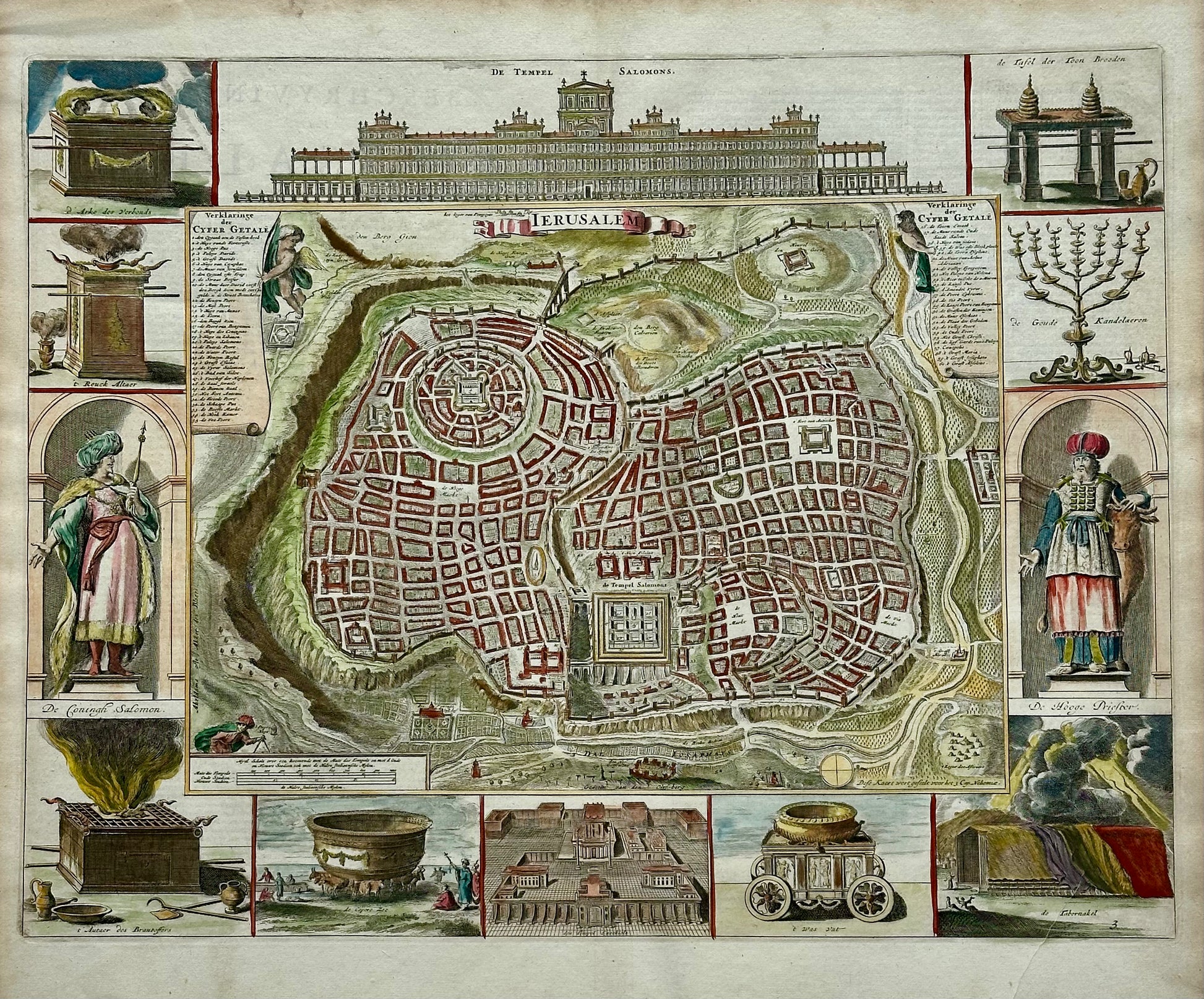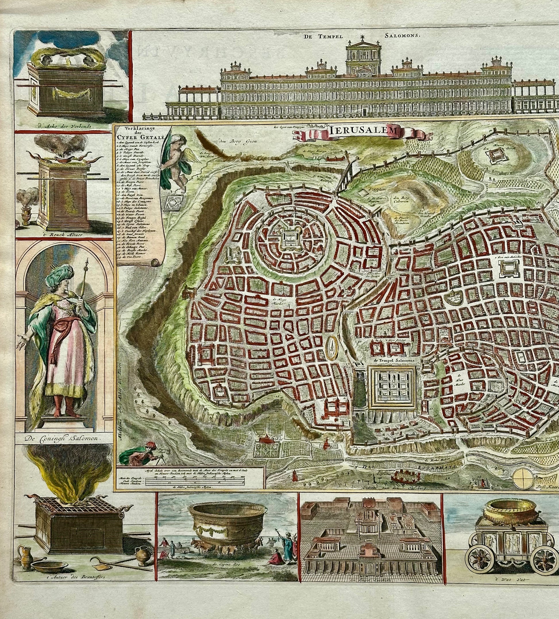 Original antique copper engraving of a bird's-eye plan of Jerusalem, created by Daniel Stoopendaal. The depiction of the holy city is surrounded by engravings of religious icons, including representations of Solomon and a High Priest. At the top, there is an elaborate elevation of the Temple of Solomon, while the bottom features a plan of the Temple of Ezekiel. The town plan itself includes numerous landmarks, with twin legends held aloft by cherubs that highlight an additional 60 sites. The work is further surrounded by 12 vignettes from the Old Testament, including scenes of Solomon's Temple and the Ark of the Covenant. Dimensions: 17 x 19 1/4"