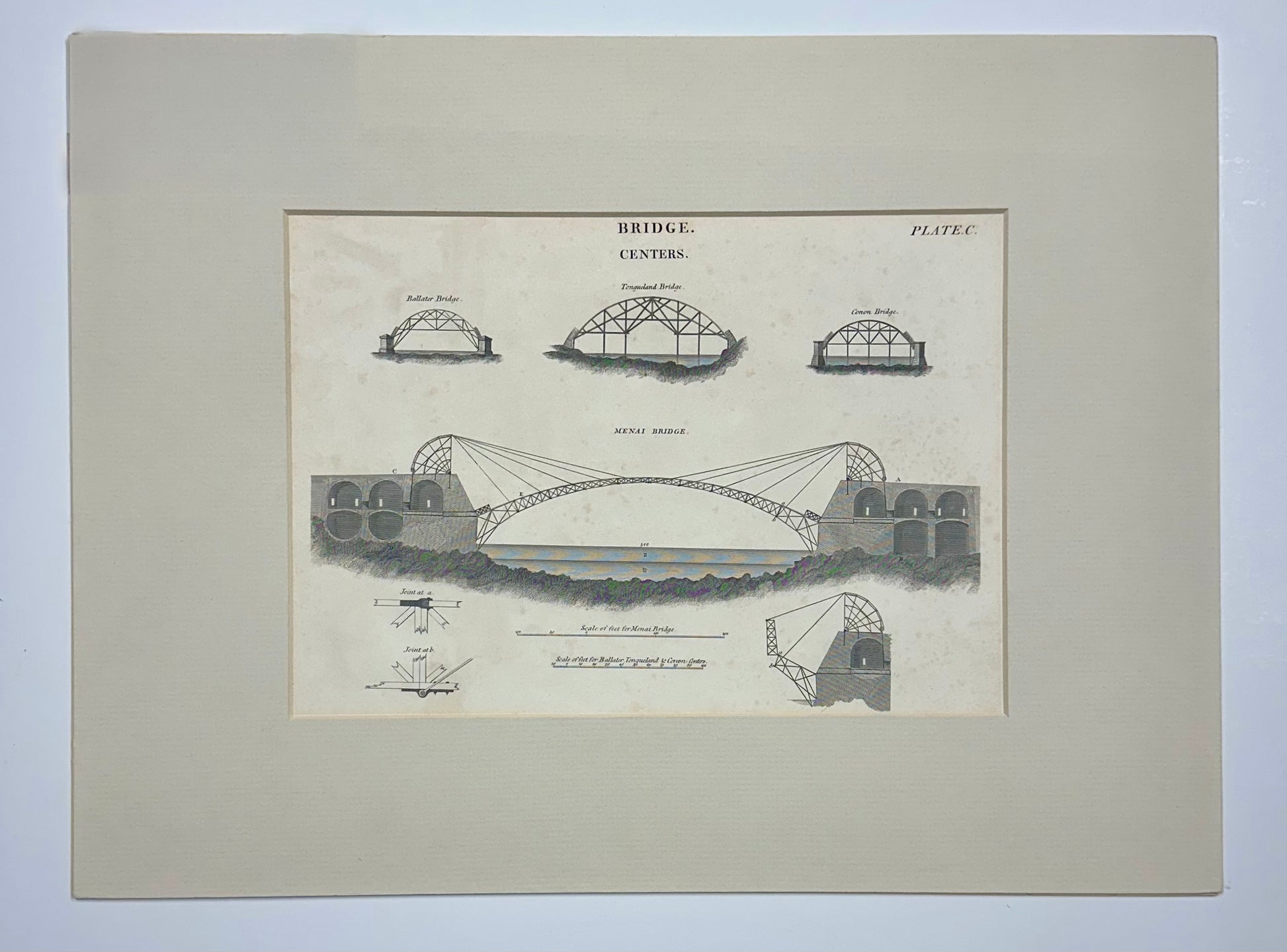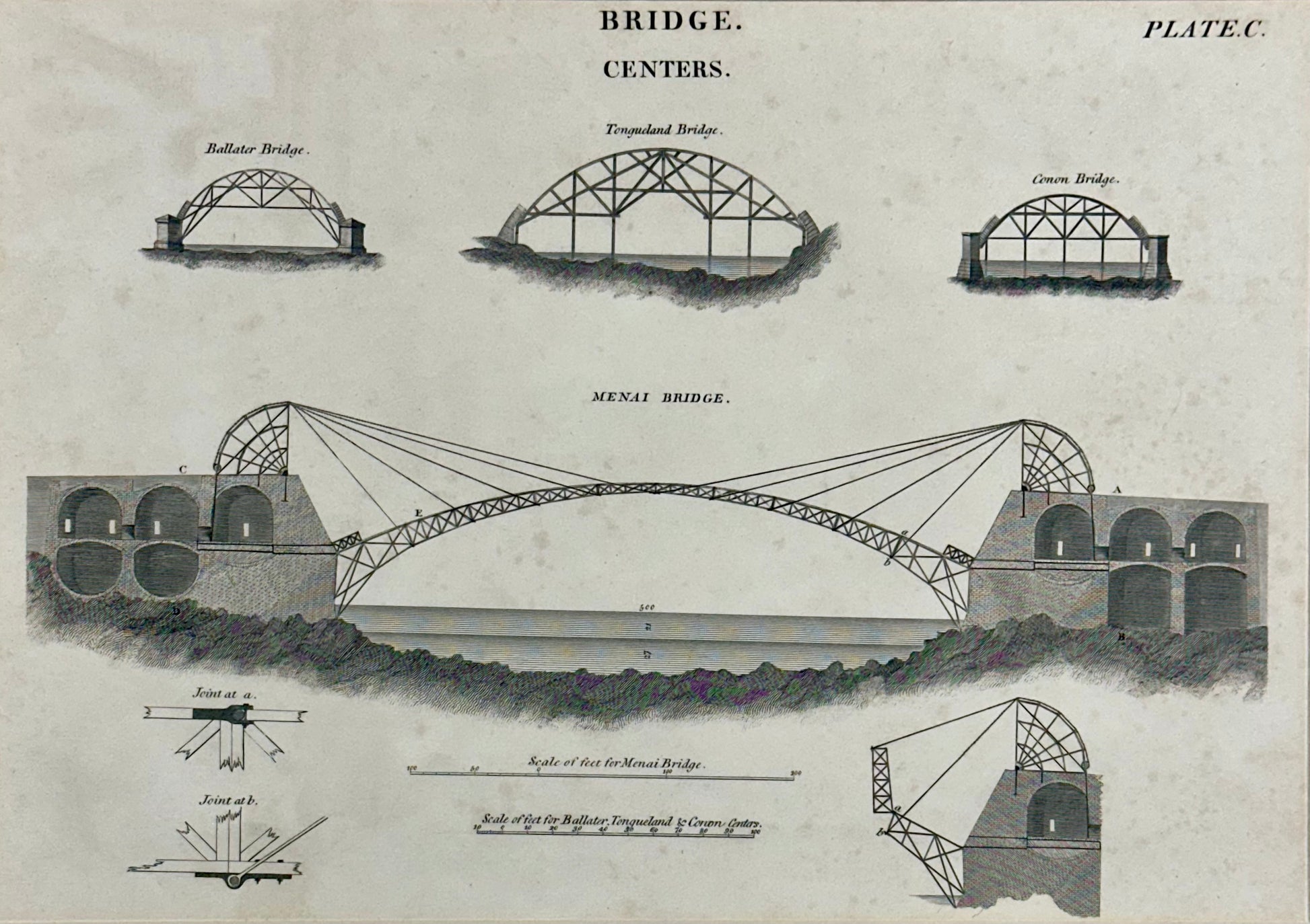 The image is a historical engineering print, depicting various bridge designs, prominently featuring Thomas Telford's Menai Suspension Bridge. The print illustrates different bridge "centers" or temporary support structures, as well as the final design and details of the Menai Bridge construction