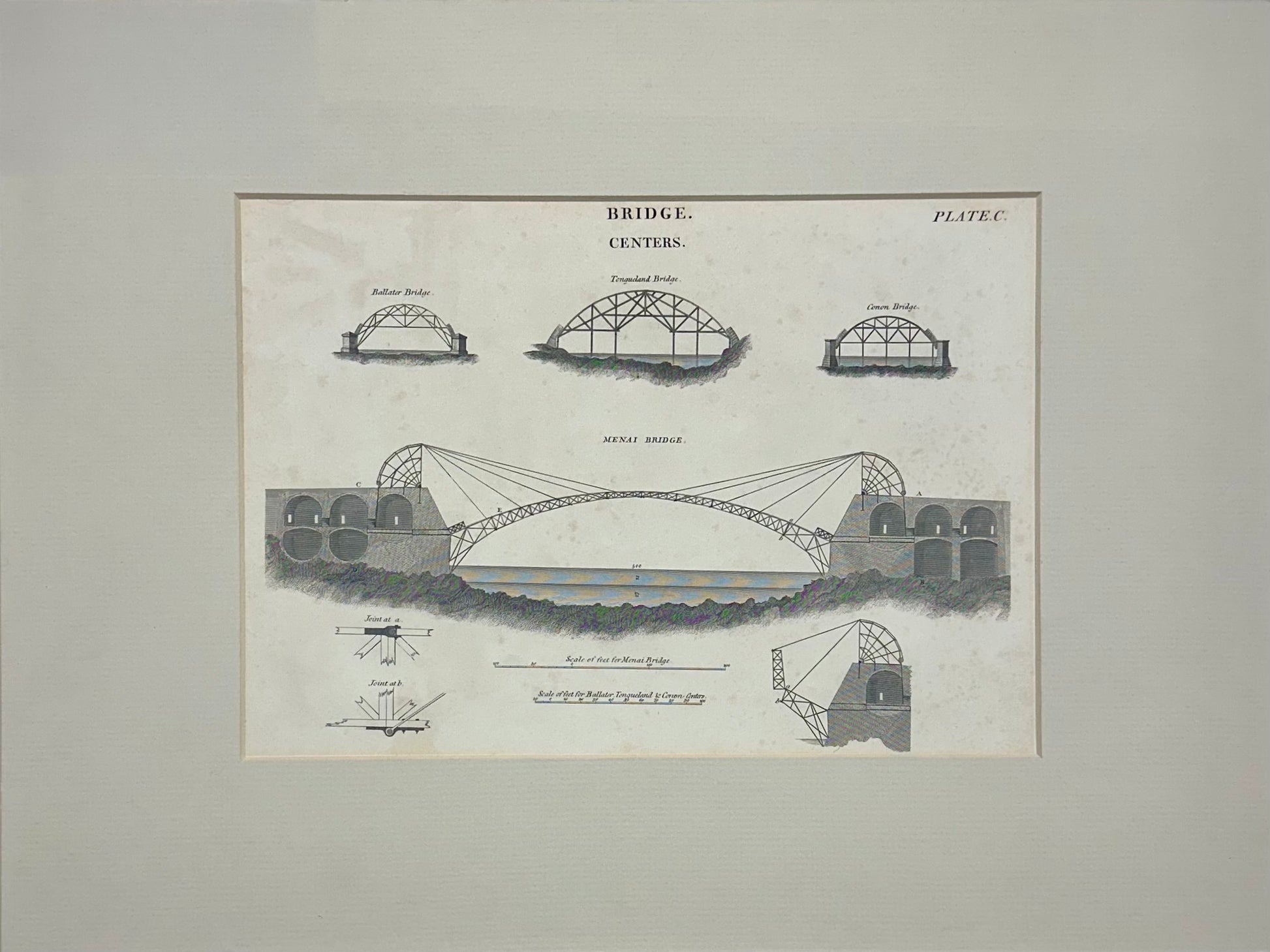 Original copper engraving by P. Nicholson, circa 1819. Print features the Conon, Tongueland, Ballater & Menai Bridge