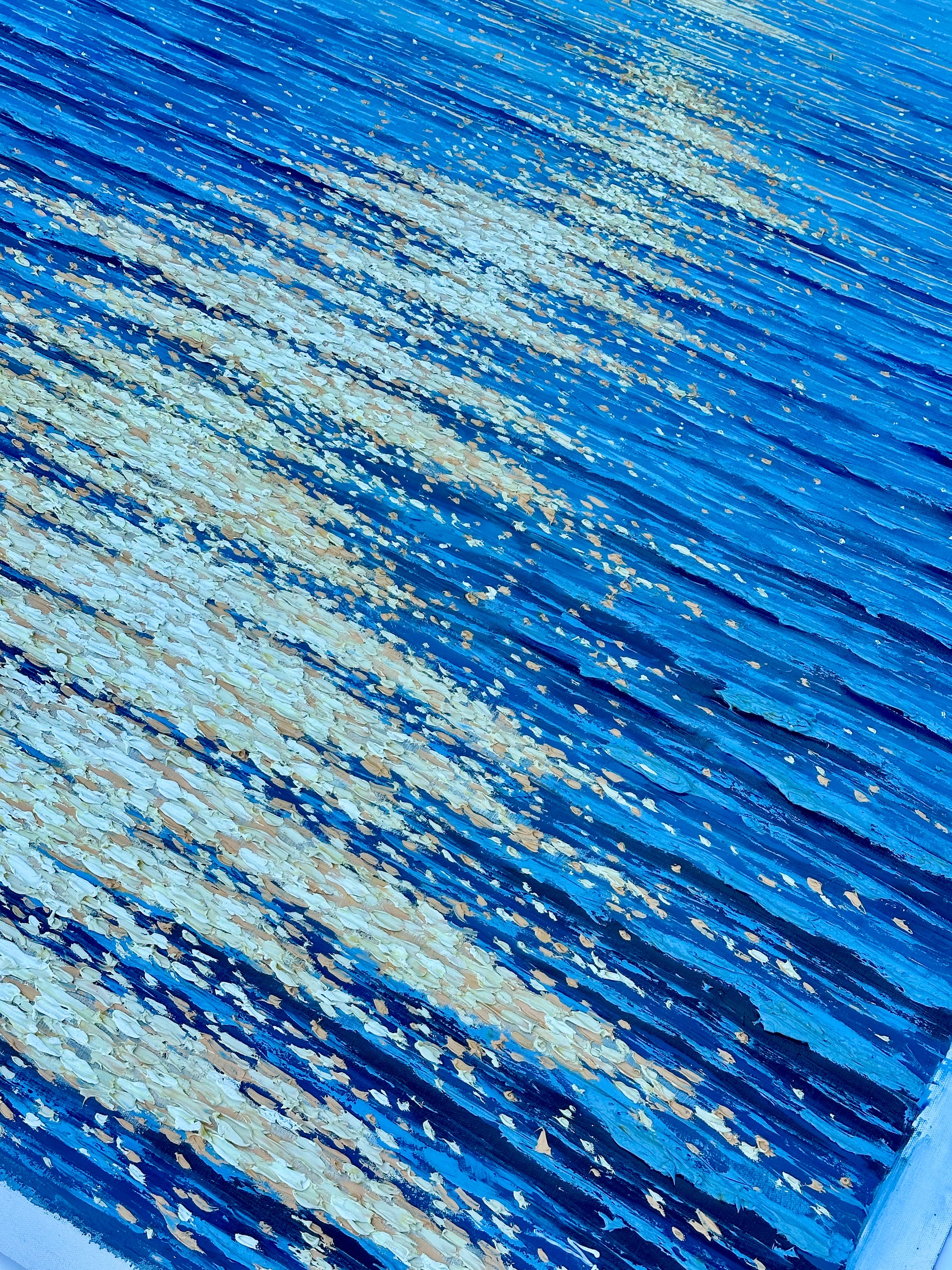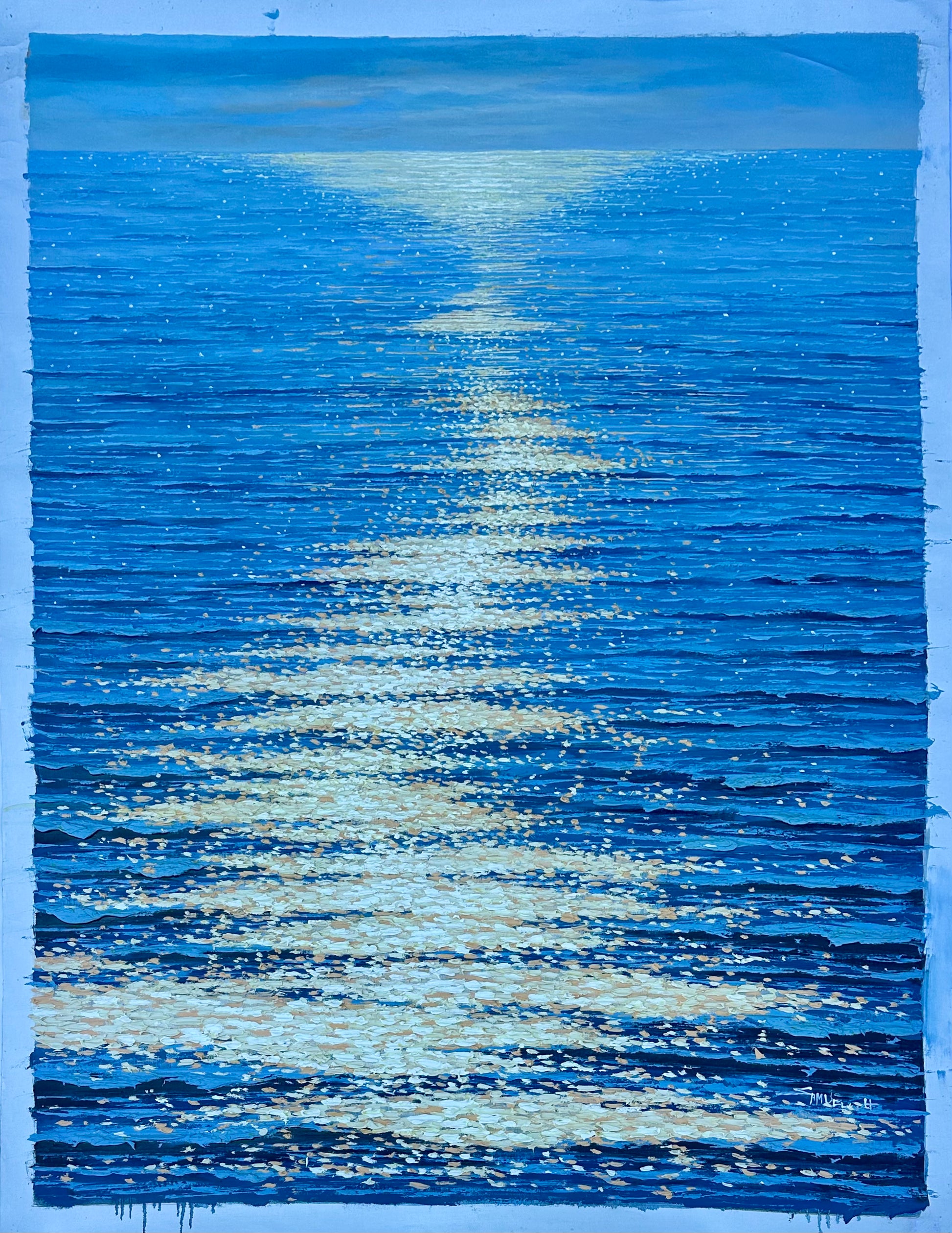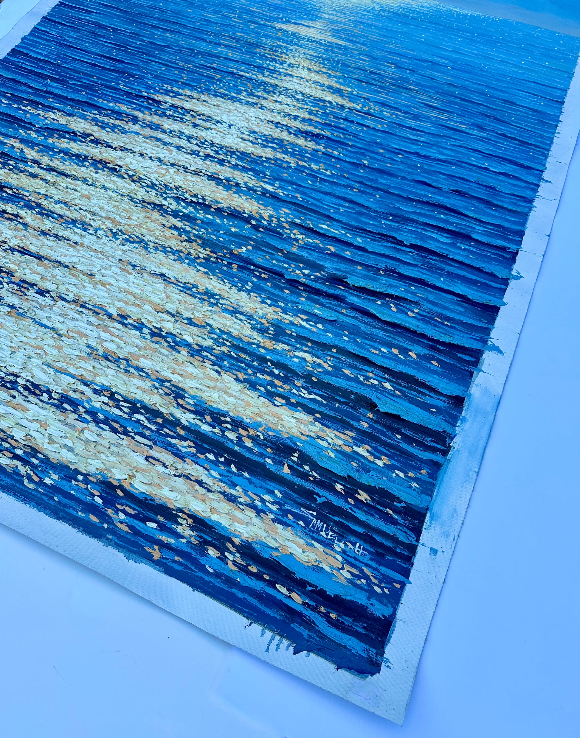 Original oil on canvas, unstretched, by artist Samuel H. The artist masterfully captures the magic of moonlight — or perhaps late-day sun — as it cascades across the water's surface in shimmering flecks of white, gold, and warm champagne.
