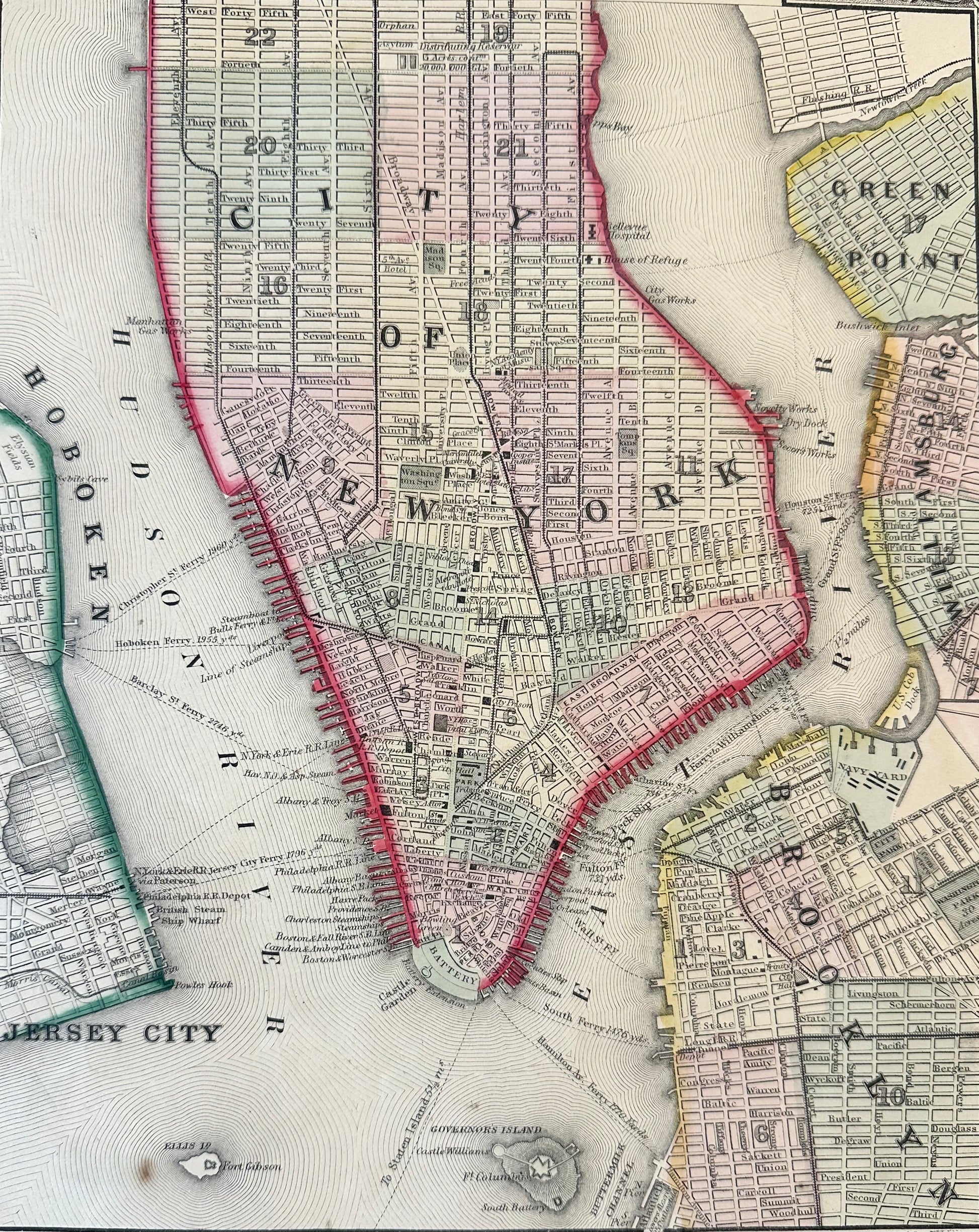 Original Steel Engraving detailing Manhattan, Green Point, Hoboken, Jersey City, Brooklyn & Williamsburg by Samuel Mitchell, 1863. Dimensions: 12 x 15.5”