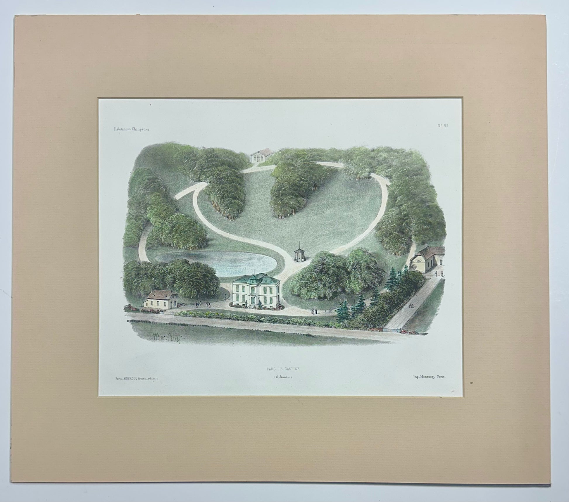 Original hand colored lithograph from Habitations Champetres by Becquet Brothers, circa 1860. The lithograph illustrates a detailed, aerial-style view of a country estate's grounds, including a large house, a pond, a small pavilion, and a winding path system designed for leisurely walks. The series documented picturesque architectural styles and garden designs for the wealthy bourgeoisie around Paris during the Second French Empire. Unframed. Dimensions: 16" x 13"