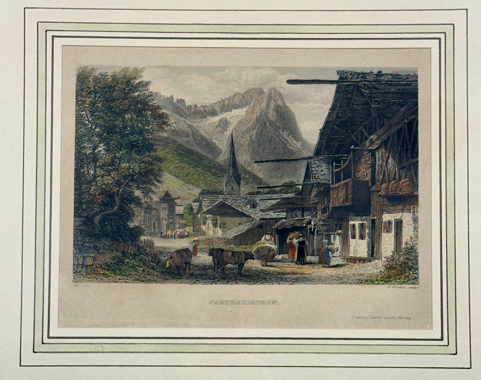 Original hand colored steel engraving from around 1840 depicting the historic village of Partenkirchen, which is now part of Garmisch-Partenkirchen, Germany. The image shows the rural character of the village, nestled in the Bavarian Alps at the foot of the Zugspitze, Germany's highest mountain. Garmisch and Partenkirchen were two ancient villages that were merged in 1935 for the 1936 Winter Olympics.