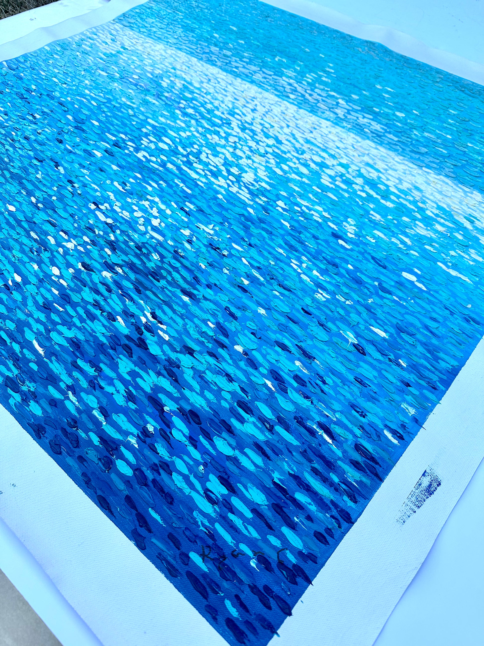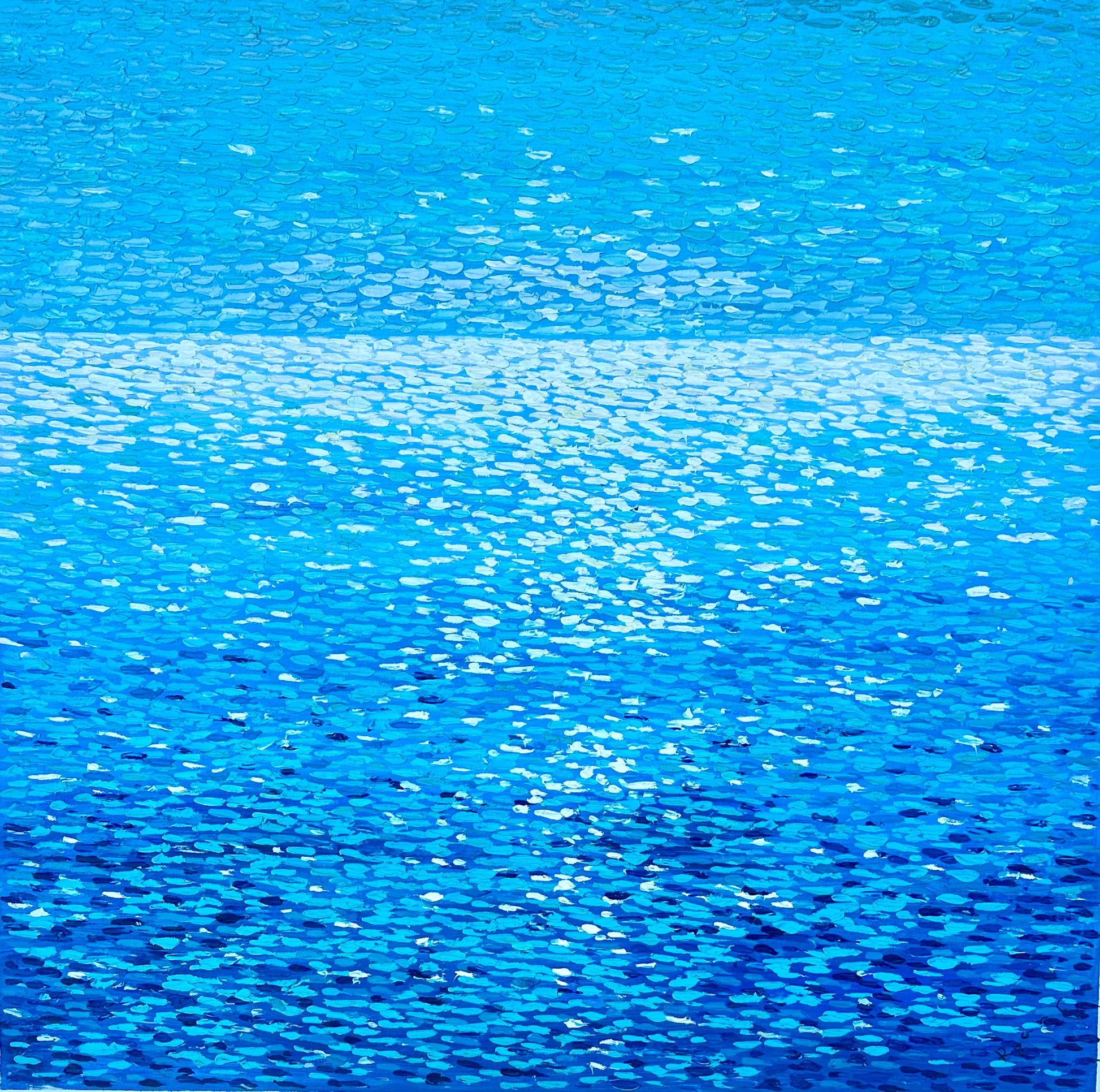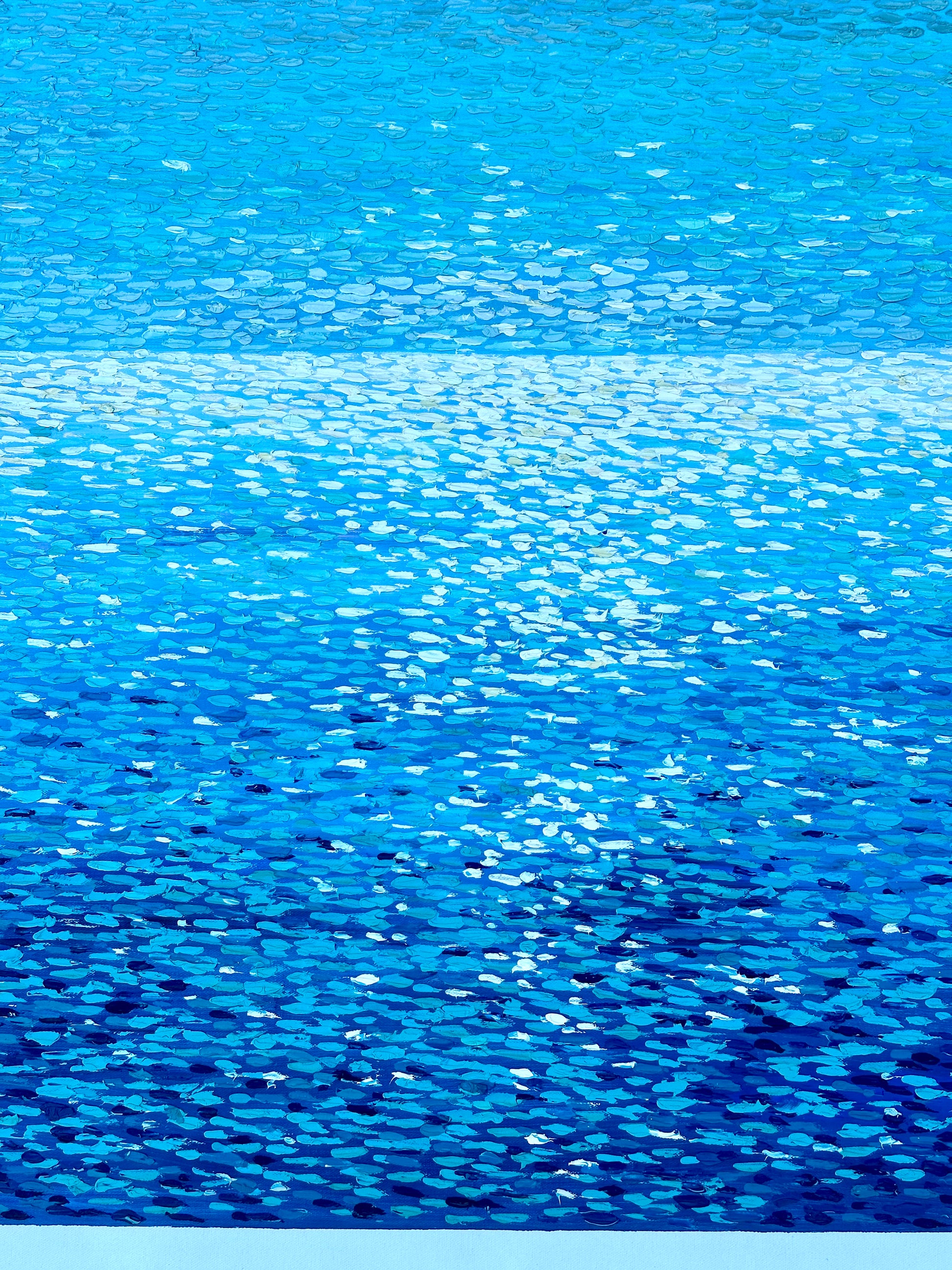 Original oil on canvas by Ryan C.. Artist Ryan achieves a remarkable sense of movement through hundreds of individually applied brushstrokes each one mimicking the glittering facets of sunlight reflecting off a calm sea. The pointillist-inspired technique gives the surface an almost tactile quality, as if the water itself is in motion.