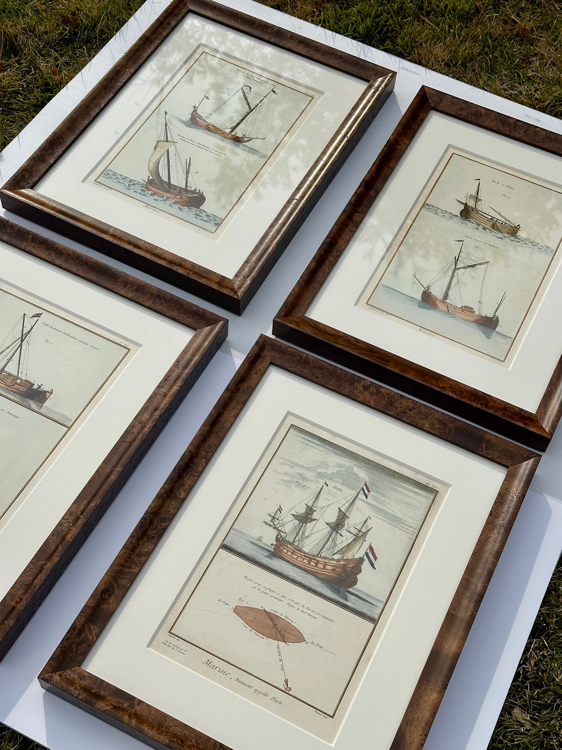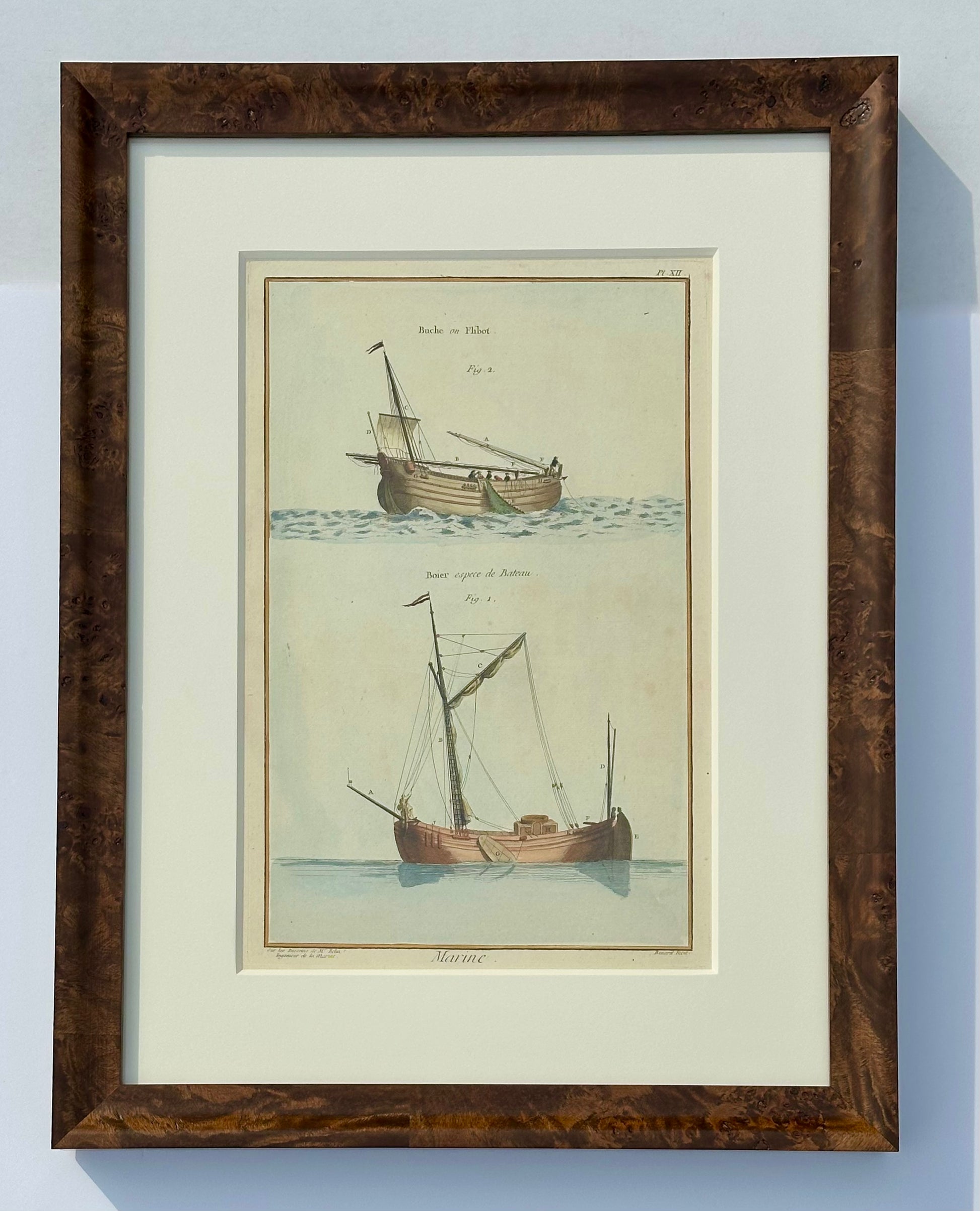Set of 4 original hand colored copperplate engravings of ships, engraved by Bernard Direxit published in Denis Diderot's Encyclopédie, circa 1750.