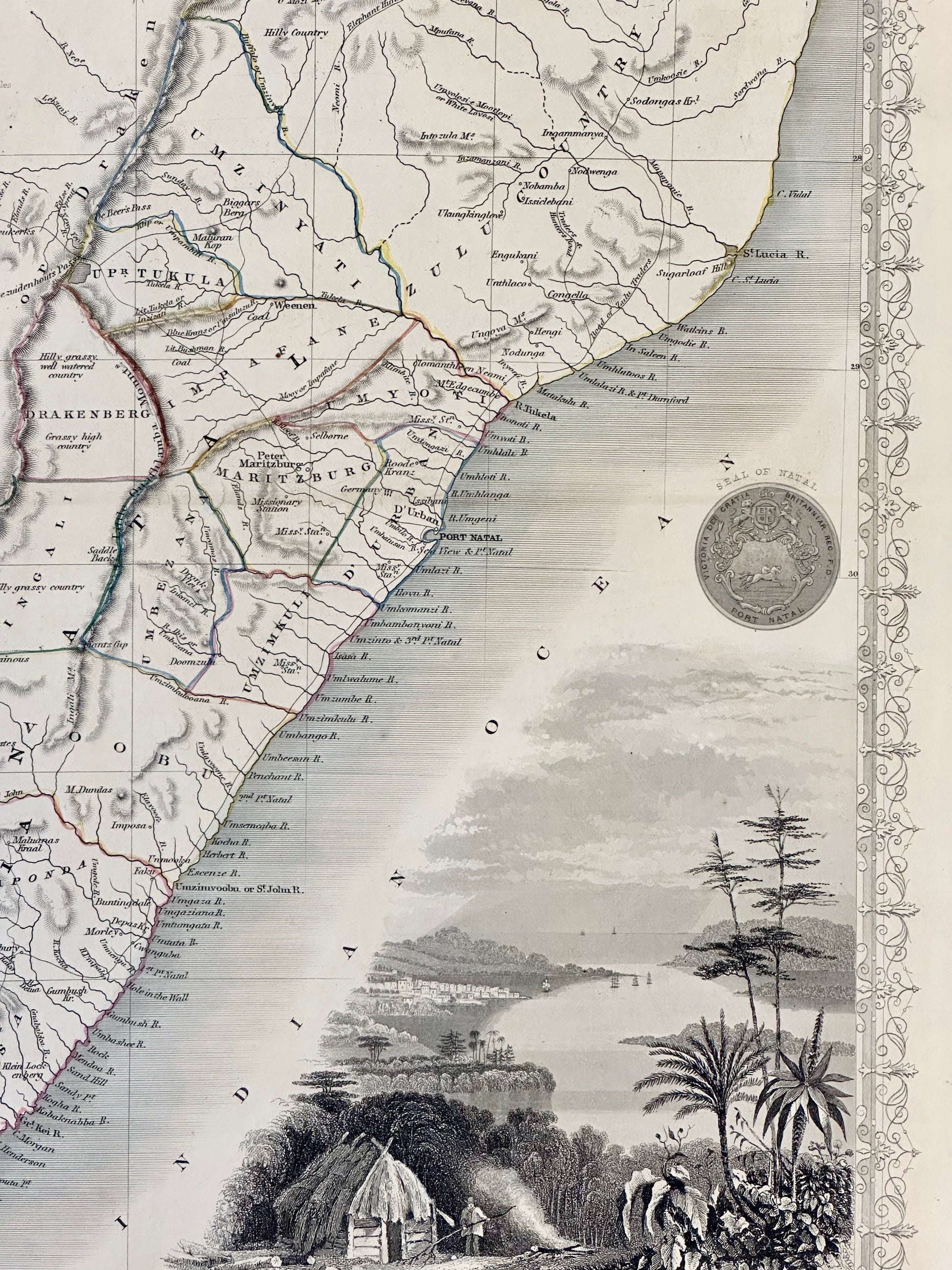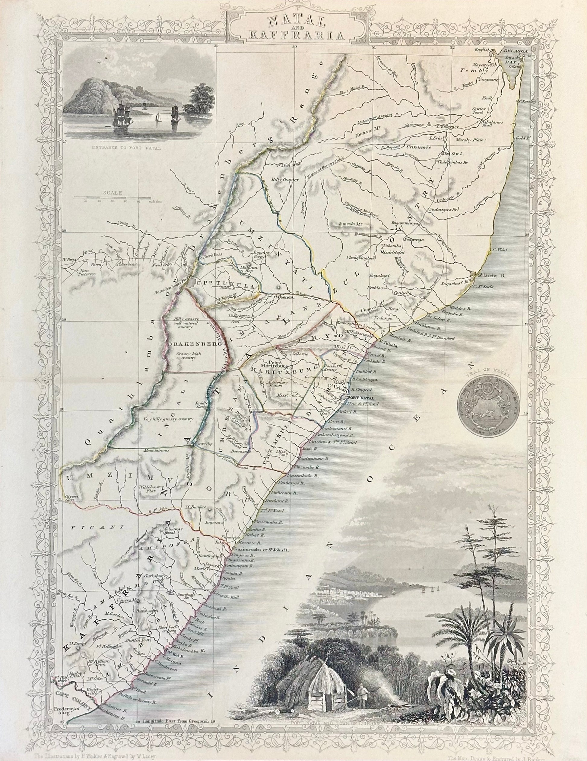 Original lithograph by John Tallis & Company of London, c. 1853. Map vignettes feature Entrance to Port Natal; Port Natal and town of Durban. Also featured are wandering tribes of Kaffirs & Zulus in lands west of the Drakensberg range & D'Urban is marked thus. Dimensions: 10 3/4" x 14"