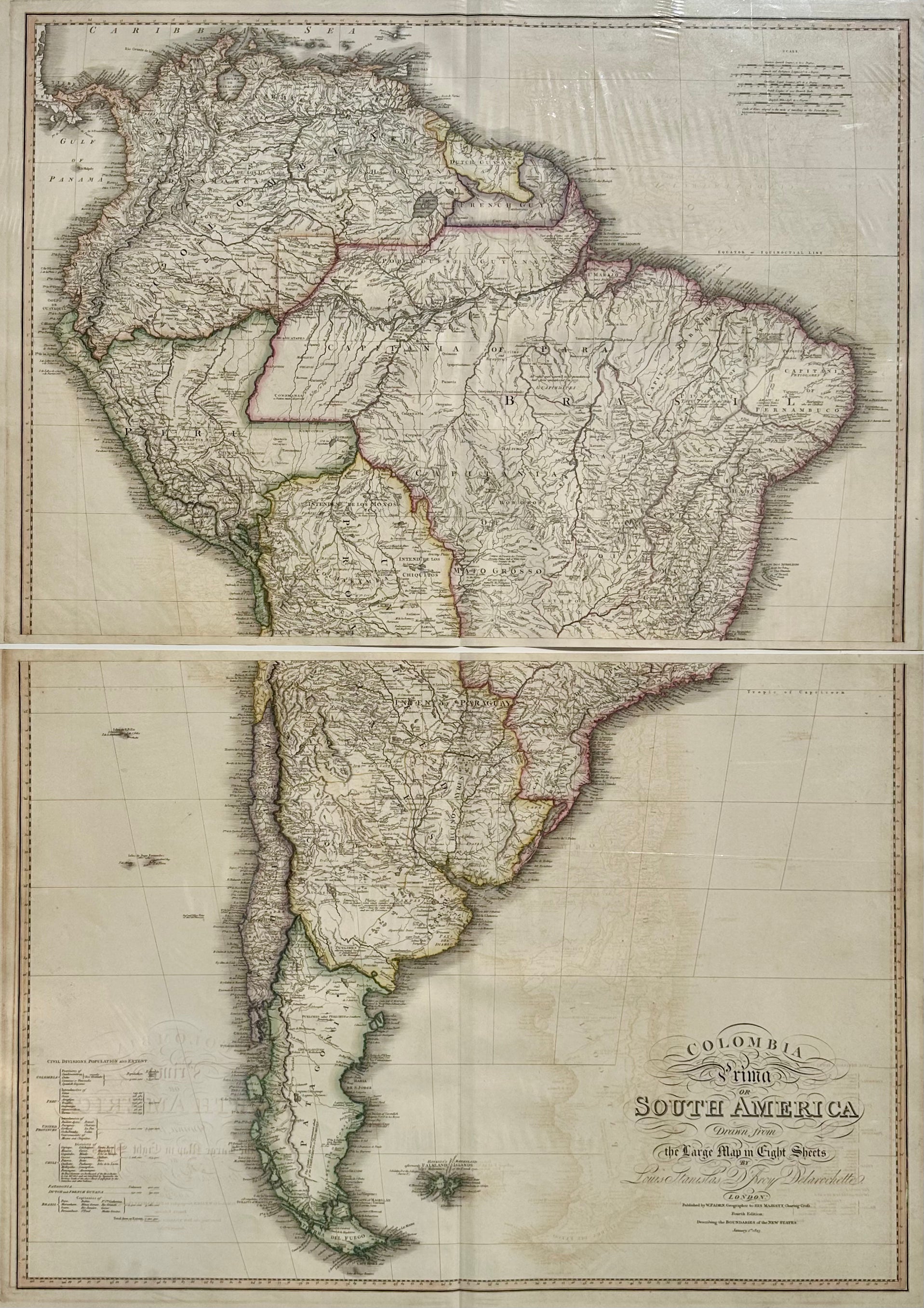 This is a rare and exceptional two-sheet engraving of South America, created at the beginning of its Century of Independence by William Faden, published in 1823. The map is based on original manuscript maps provided to His Excellency the late Chevalier Pinto, João Joaquim da Rocha, João da Costa Ferreira, and El Padre Francisco Manuel Sobrevida, as well as from the most reliable and documented accounts of those countries. Unframed. Dimensions: 33 x 47"