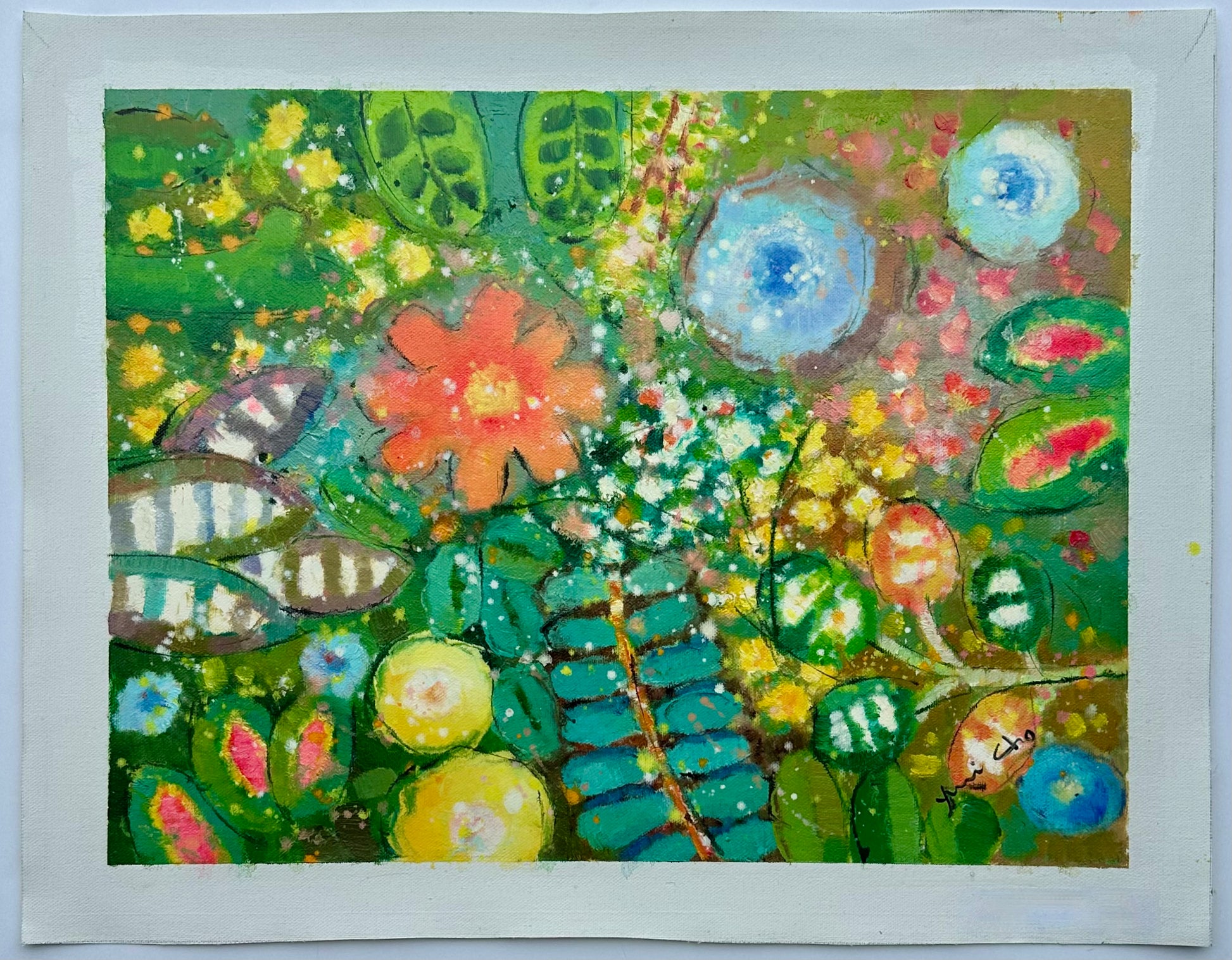 Original oil on canvas on unstretched canvas, measuring 16 x 12”. This is an original floral oil painting on canvas signed by artist Youn Cho. She is known for her vivid and spontaneous artistic style. The painting features vibrant, expressive brushstrokes and a rich color palette of yellow, coral, blue, green, and orange flowers.