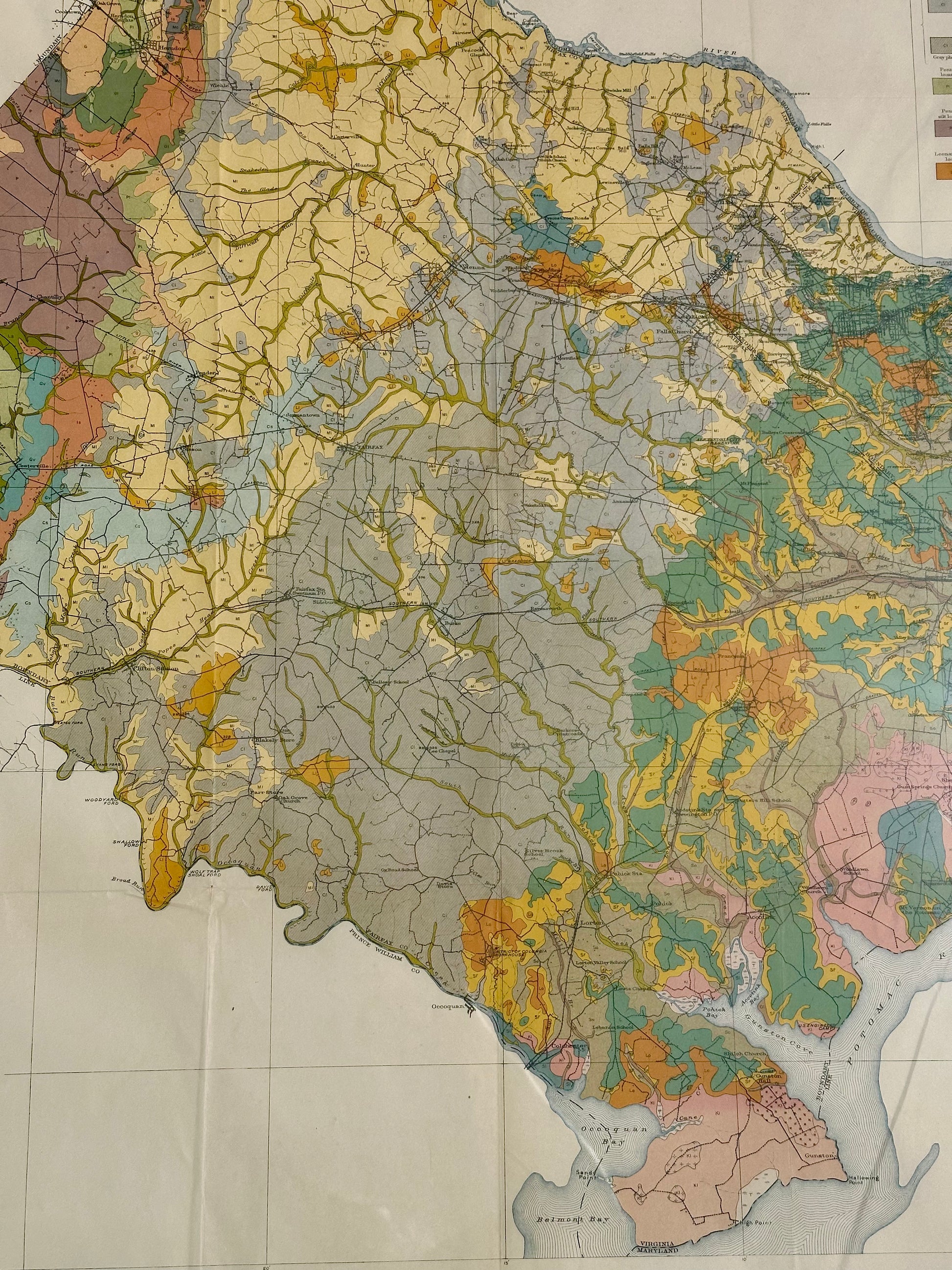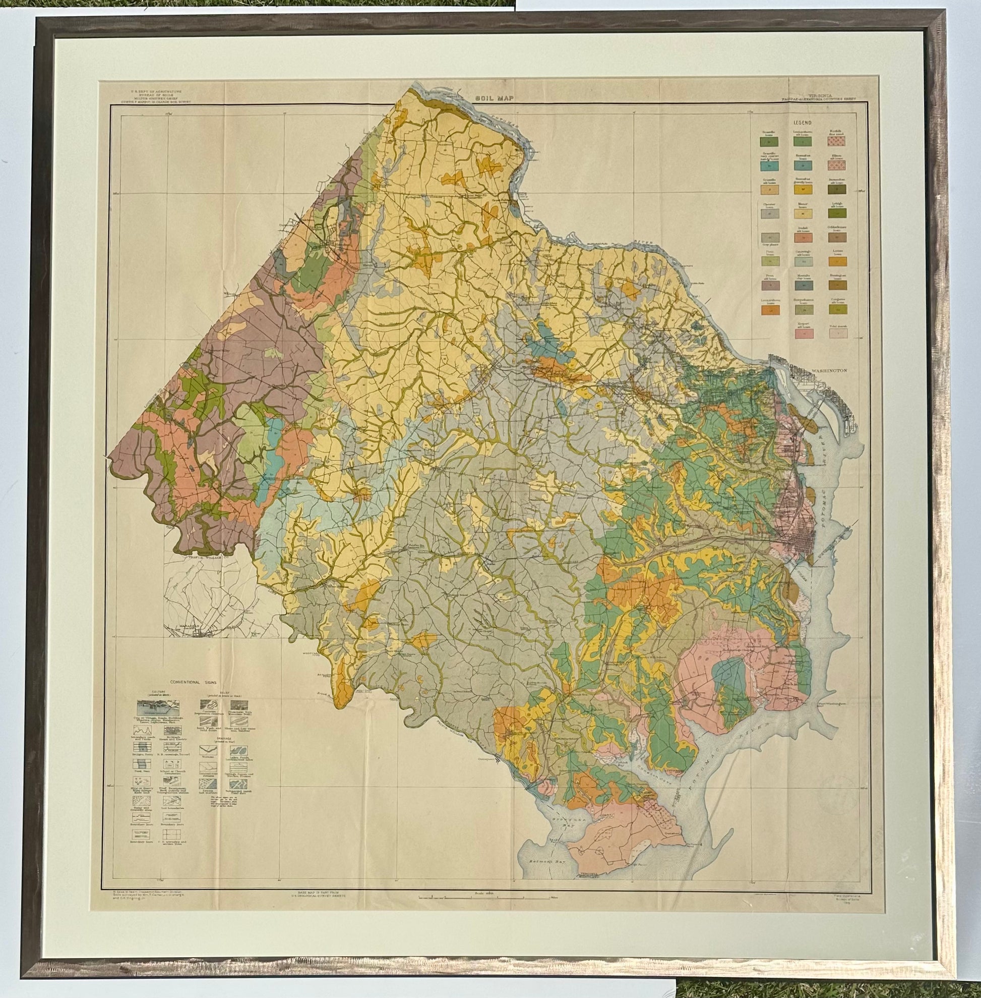 Fairfax & Alexandria county Virginia map. Original Steel Engraving by Kingling, Bureau of Soils, 1915. Custom framed with UV-resistant glass in a wood frame with a metallic finish. Dimensions: 35 1/2" x 39"