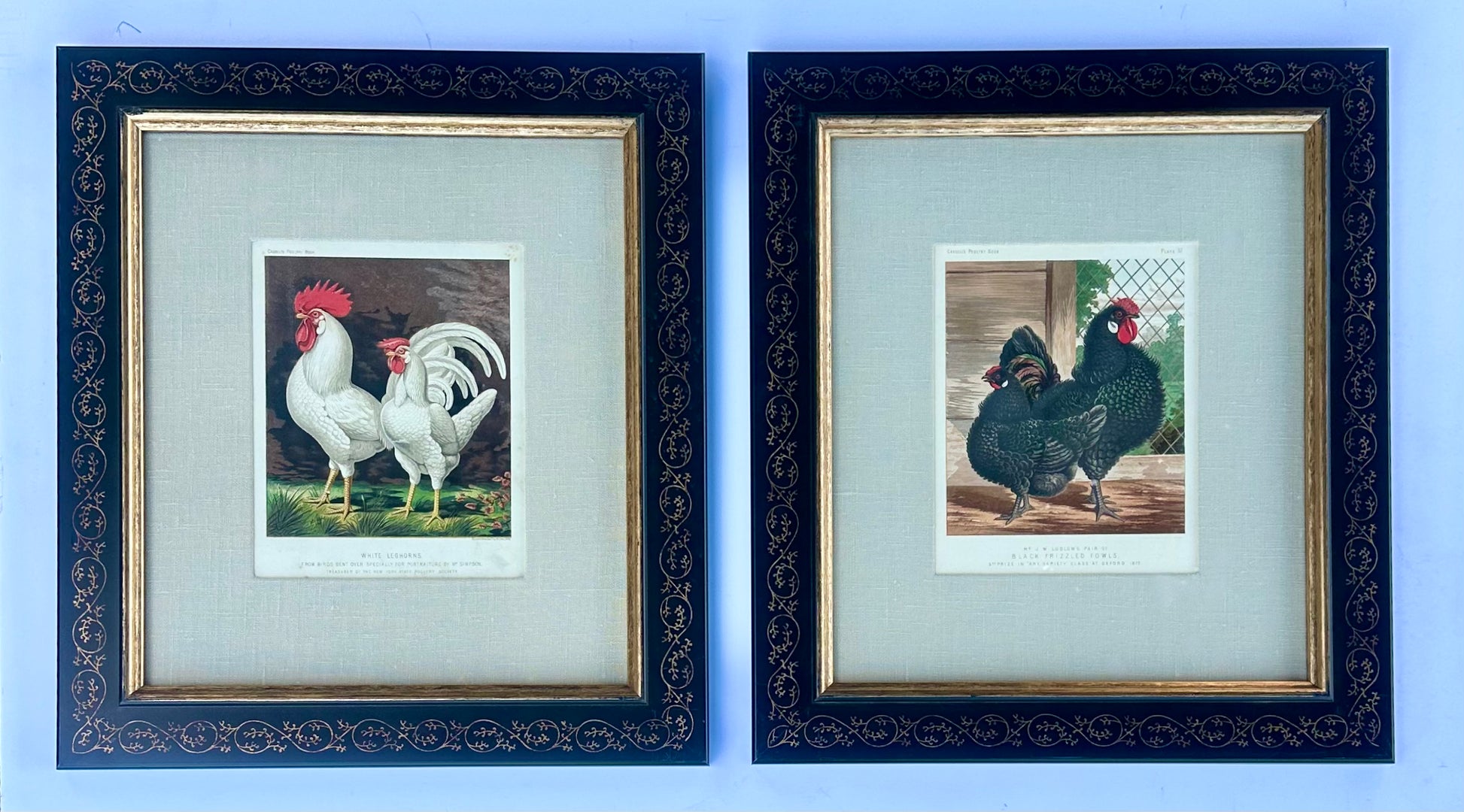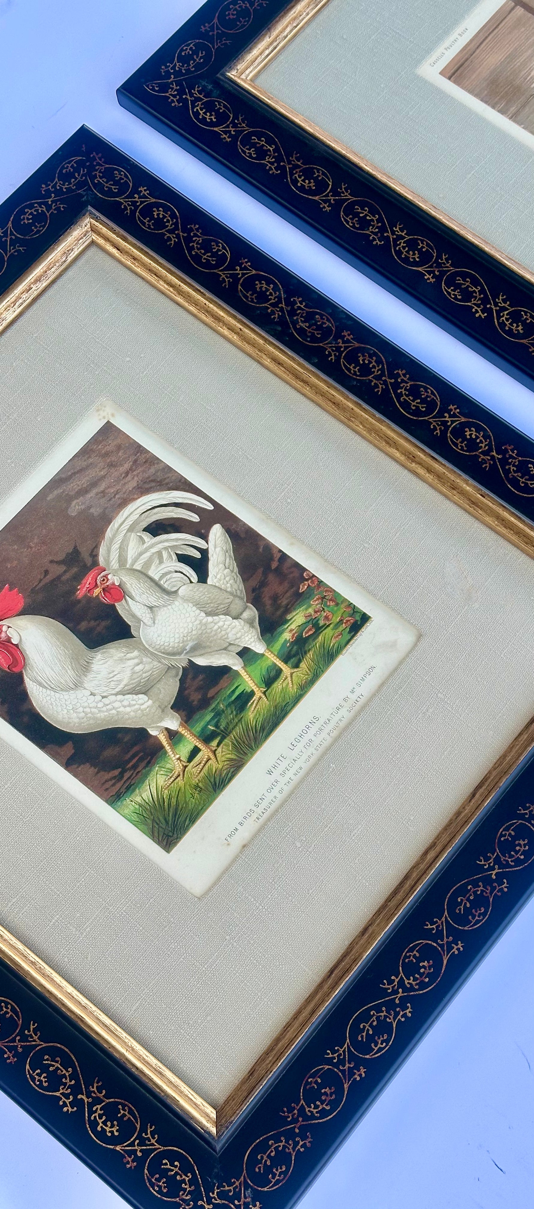 Set of 2 original framed chromolithographs from Cassell's Poultry Book, circa 1890. Featuring beautifully illustrated prize-winning chicken & fowl breeds. Featuring the Leghorn Chicken & Black Polish Fowl. Each print showcases the exquisite detail and vibrant colors characteristic of Victorian-era agricultural illustration.